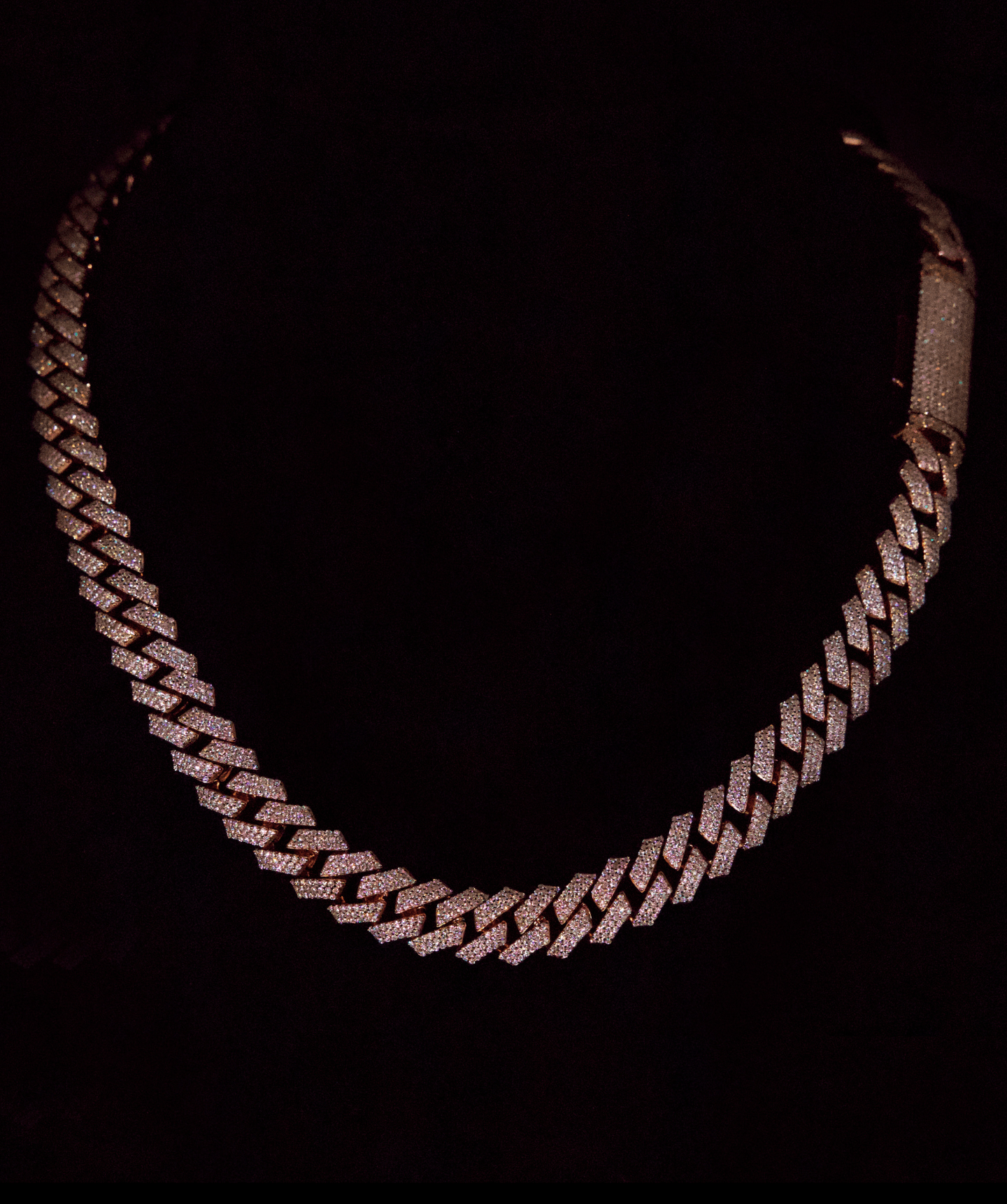 The ICED LONDON 12mm Prong Cuban Link Chain redefines a classic with bold structure and unmatched brilliance. Each meticulously set VVS Moissanite stone catches the light, while the prong setting enhances depth and dimension. Crafted from 925 silver and finished with a rich rose gold plating, this piece offers both presence and durability. Secured with a box clasp for a seamless fit.
