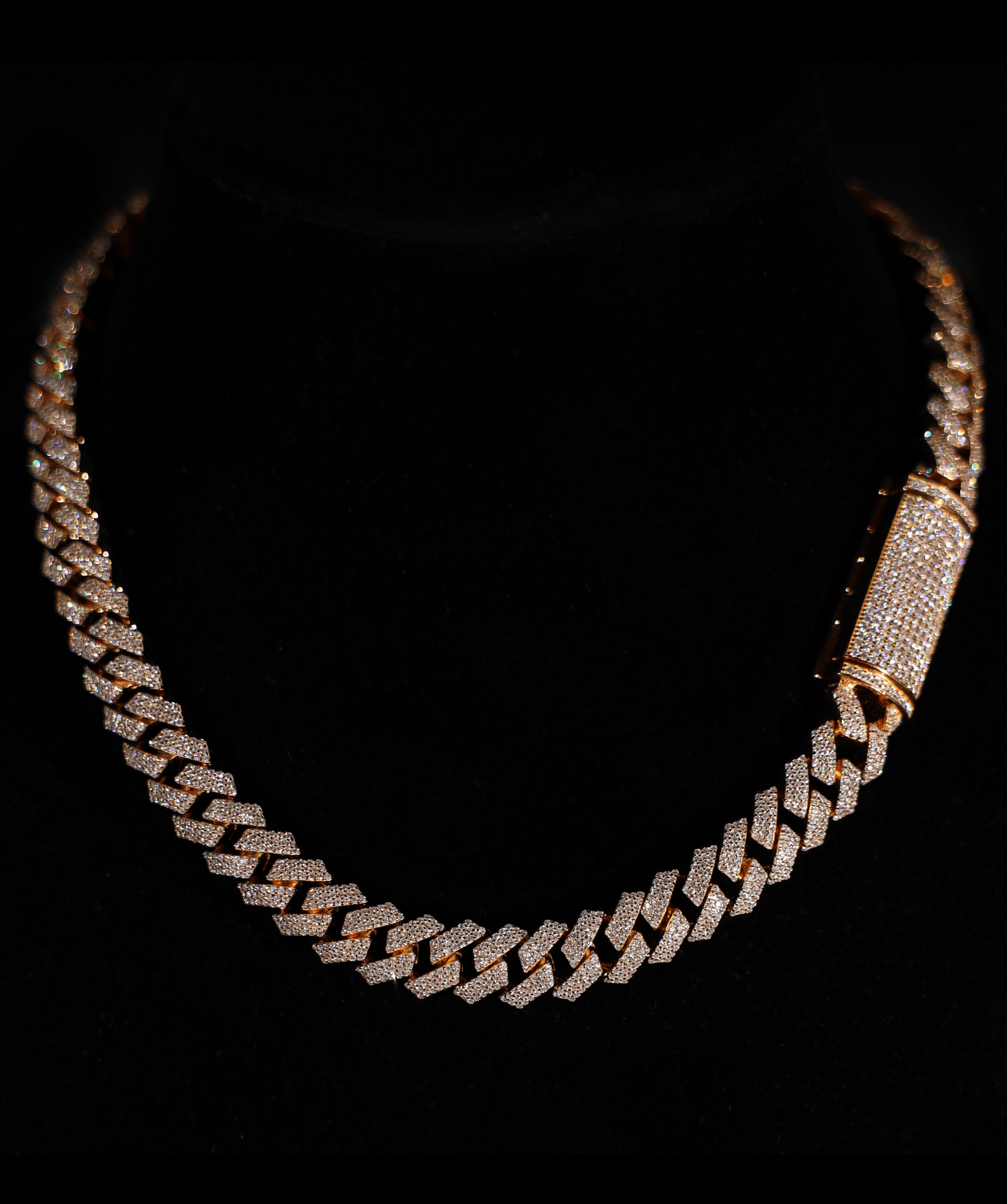 The 12mm prong Cuban link chain is a statement of precision and craftsmanship. Every stone is prong set, allowing for maximum light reflection and depth. The 925 silver base, finished in yellow gold, enhances durability and sheen, ensuring a lasting presence. The links are structured for a solid, weighted feel, with a box clasp detailed in pavé-set stones for a seamless yet functional closure. A signature piece, designed for those who recognise impact in the details.