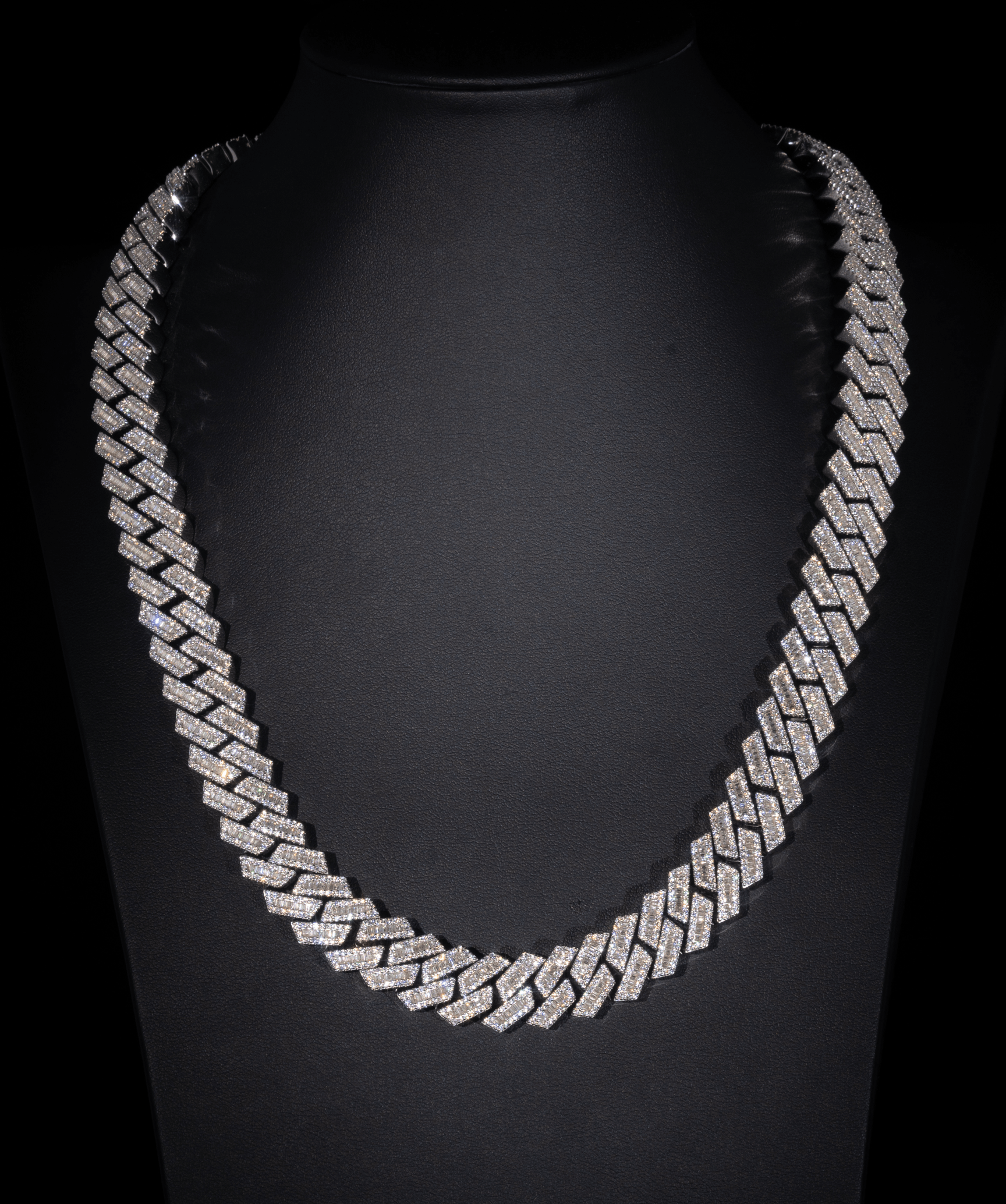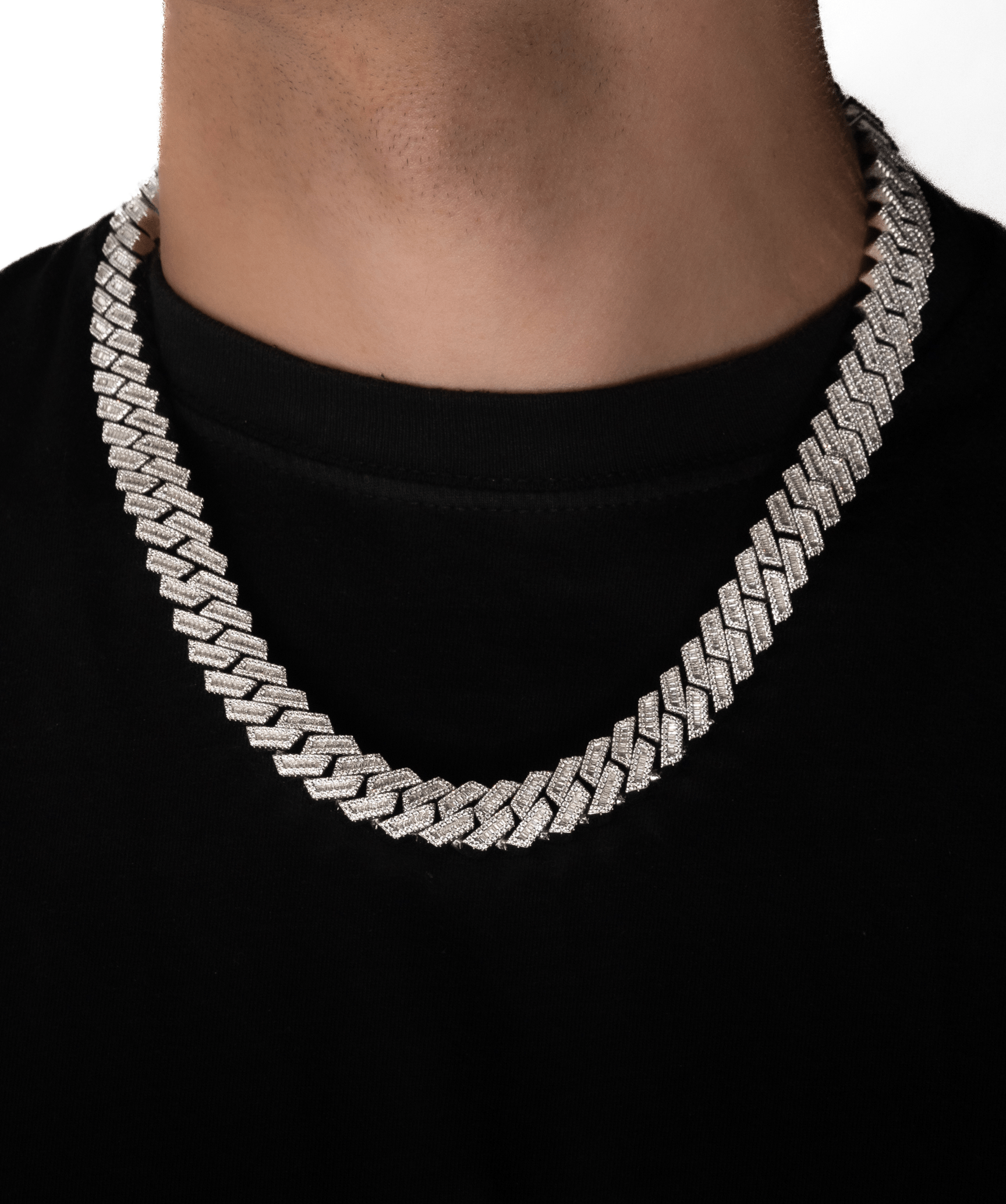 A bold fusion of structure and refinement, the 15mm Baguette Prong Cuban Link Chain is engineered for those who command attention. Each meticulously prong-set baguette forms an unbroken stream of brilliance, amplifying the chain’s powerful silhouette. Handcrafted in London, this chain is not just jewellery - it is a statement of dominance.
