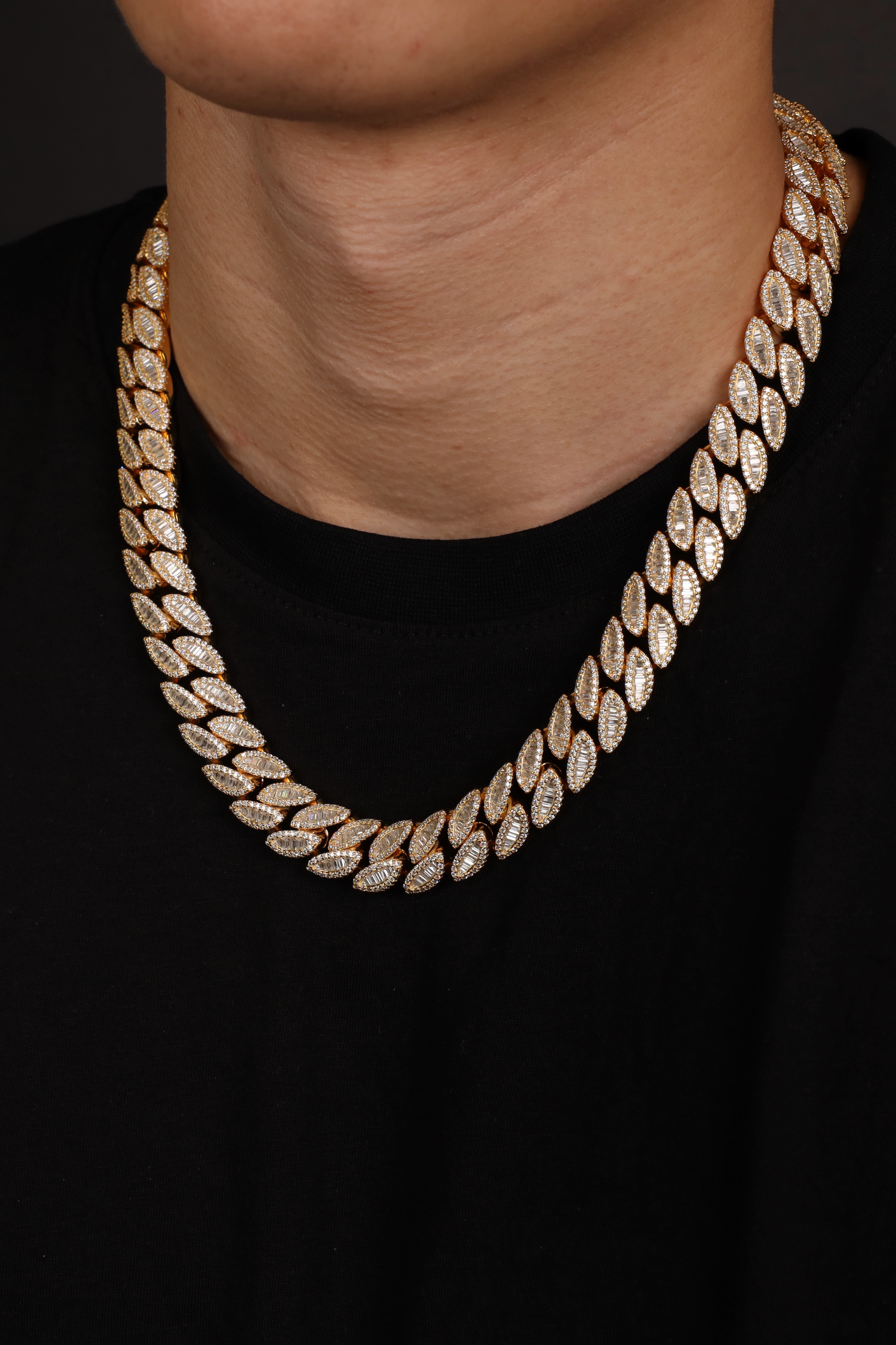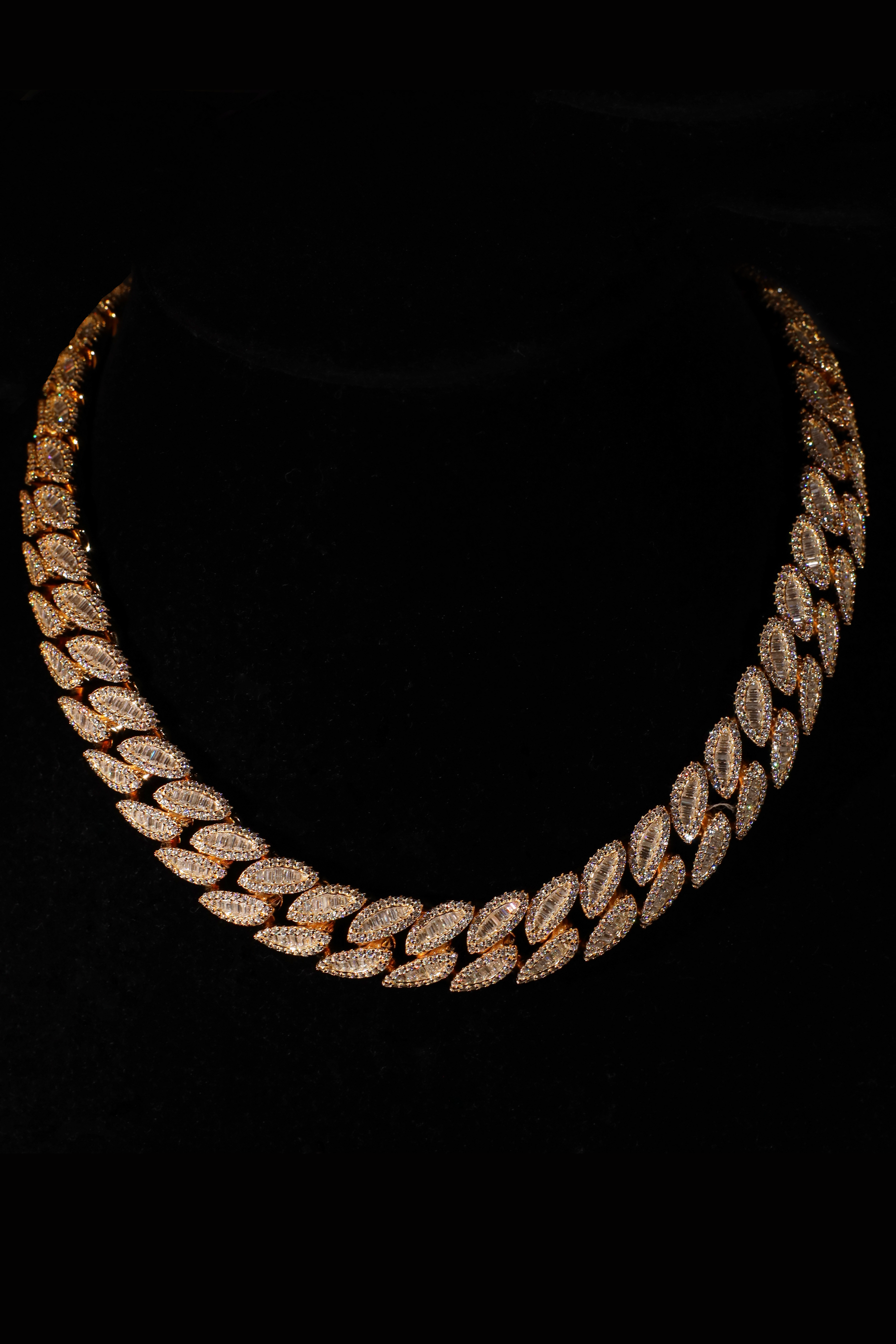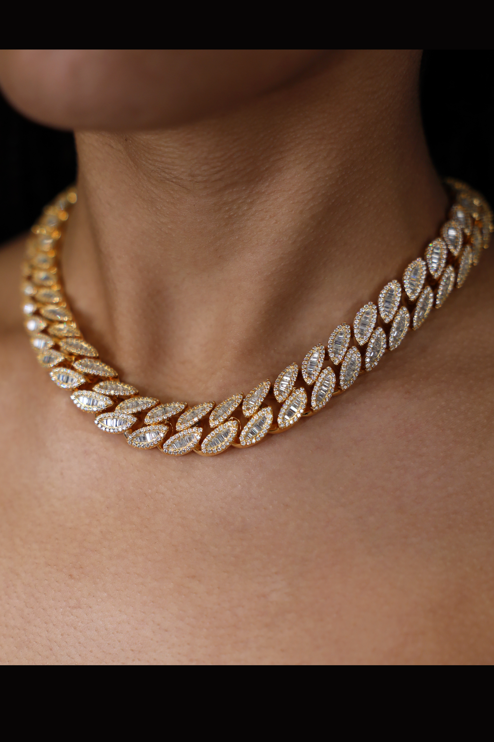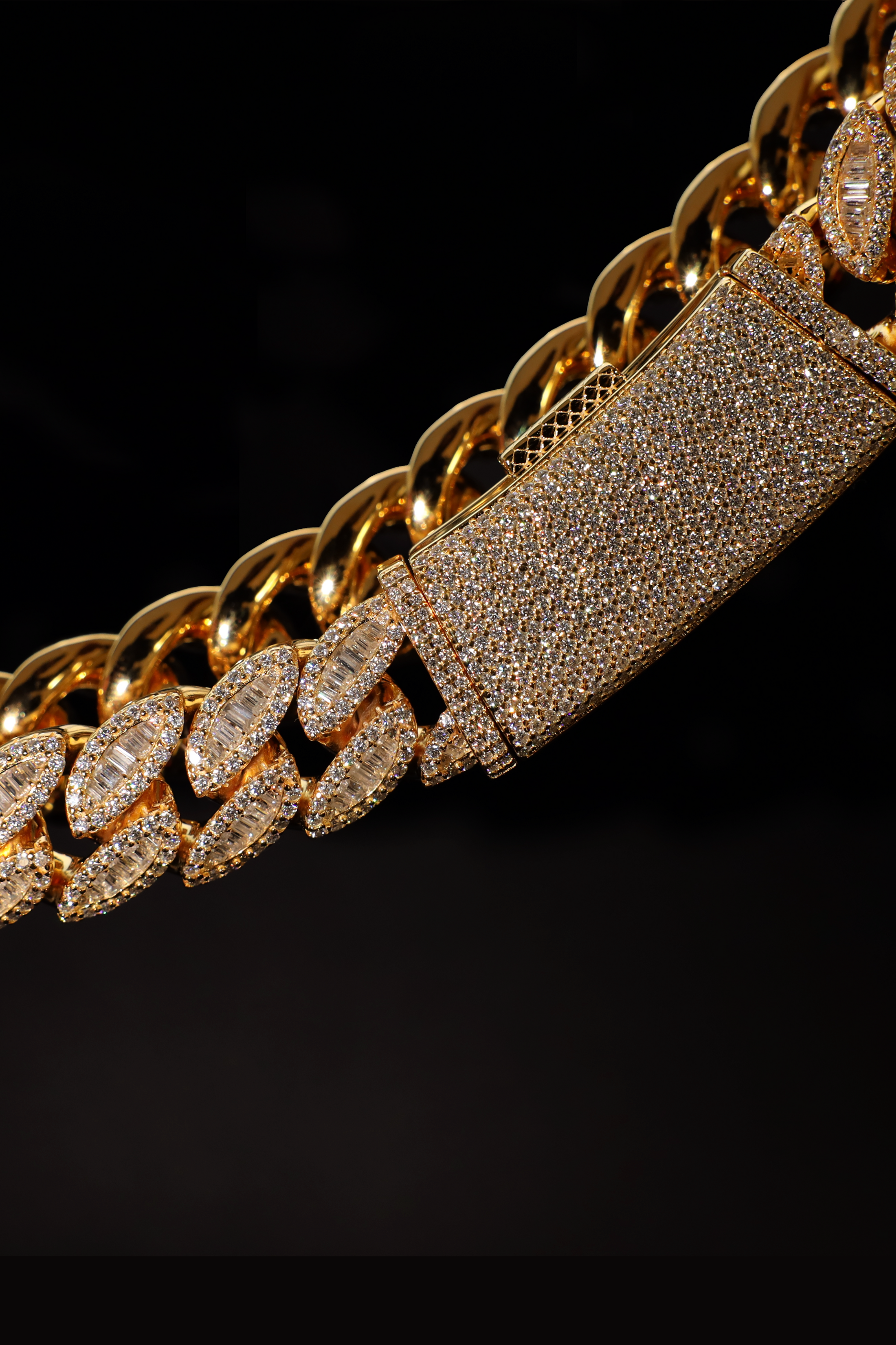 Each link is crafted with precision, featuring an elongated oval silhouette adorned with an array of meticulously set pavé stones. Baguette-cut stones accentuate the centre, adding dimension and depth to the composition. The curvature of the links ensures a seamless flow, allowing the chain to sit with effortless dominance around the neck. Its substantial 16mm width strikes the perfect balance between boldness and sophistication, making it an essential statement piece.