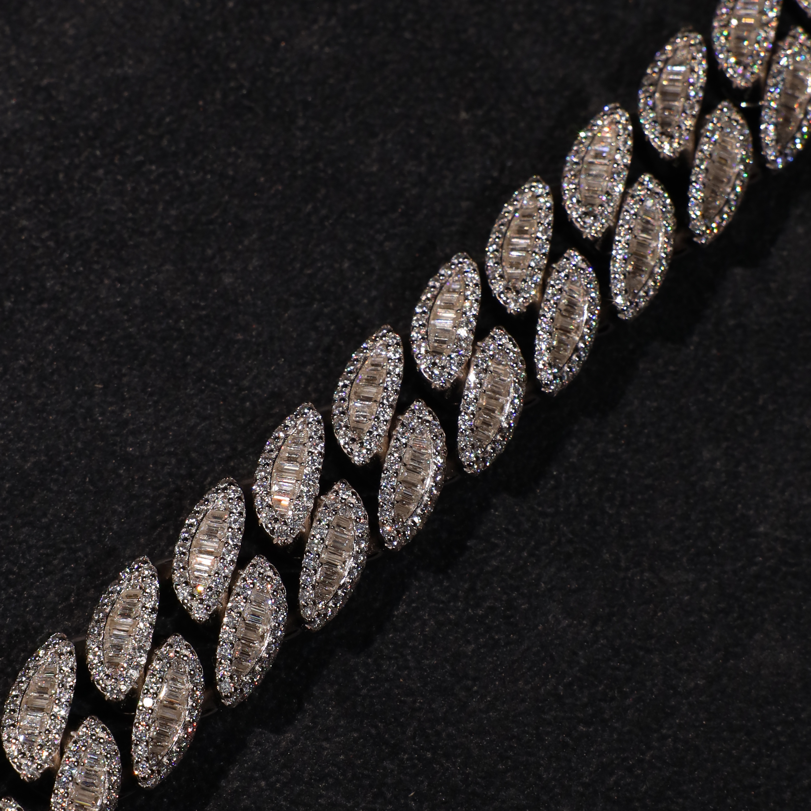 A bold yet elegant expression of refinement, the 16mm Oval Baguette Cuban Link Bracelet is a masterpiece of modern luxury. Its distinctive marquise-shaped links, encrusted with precision-cut baguette diamonds, create a fluid silhouette of brilliance, designed for those who appreciate unparalleled craftsmanship.
