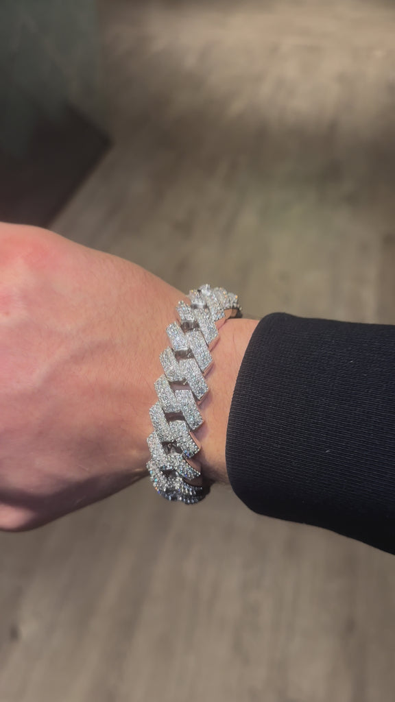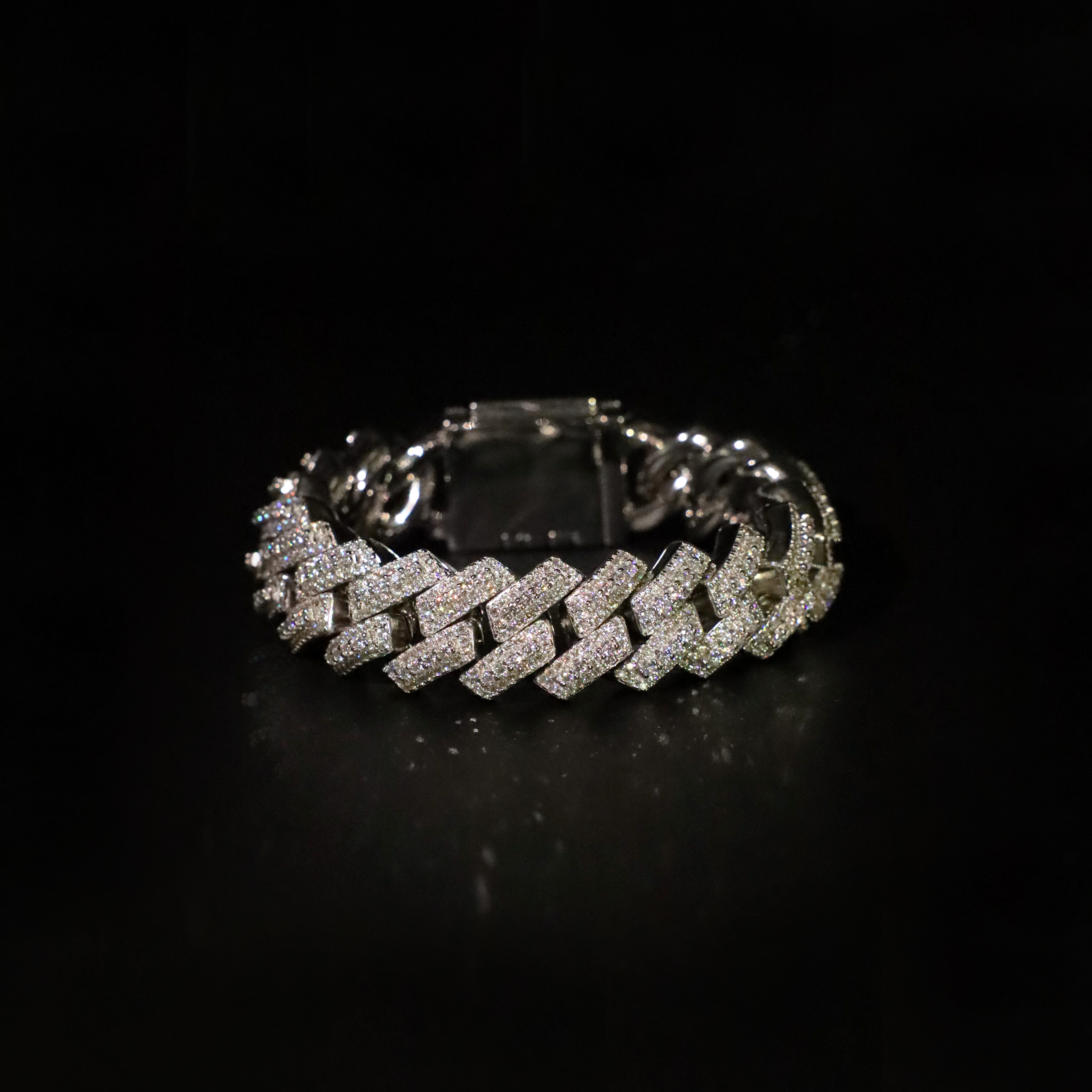 A masterful fusion of power and refinement, the 19mm Prong Cuban Link Bracelet commands presence with its intricate pavé setting and bold, interlocking silhouette. Every link is handset with precision-cut diamonds, maximising brilliance and fluidity in motion. Designed for those who understand that luxury isn’t just worn—it’s lived.