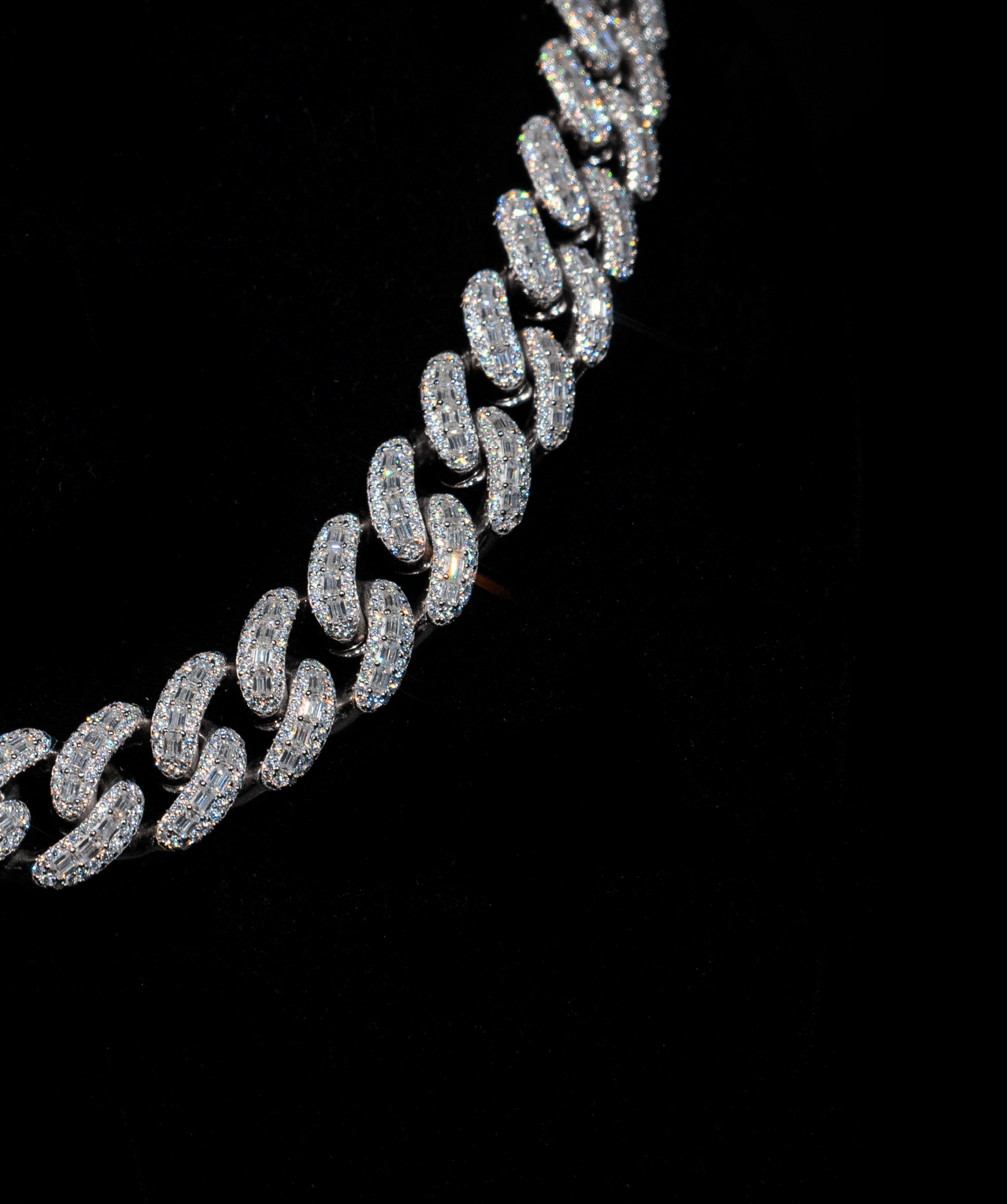 A bold fusion of strength and refinement, the 20mm Emerald Cut Cuban Link Chain radiates with commanding brilliance. Each meticulously handset emerald-cut stone amplifies its powerful silhouette, creating an unmissable statement of prestige.
