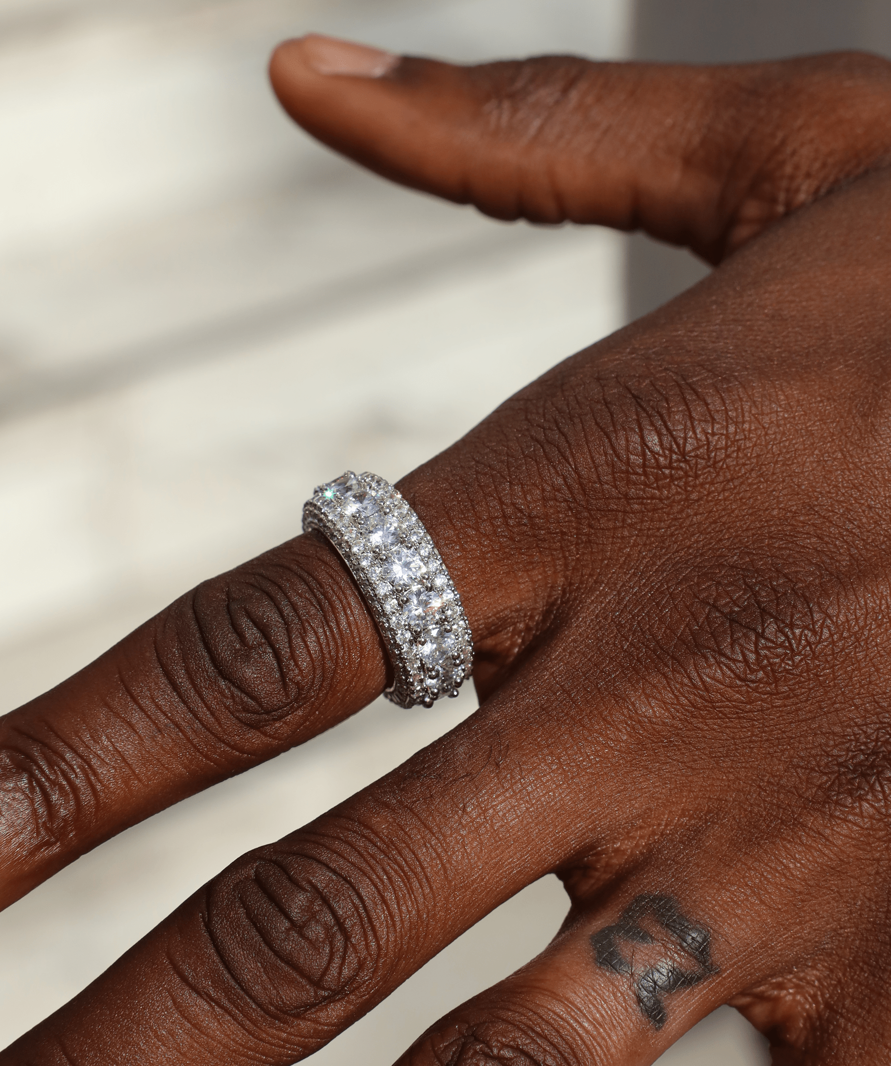 A statement of brilliance and boldness, the 5-row band ring delivers an unmatched shine with its layered, fully iced design. Whether worn alone or stacked, it exudes a commanding presence with every movement.