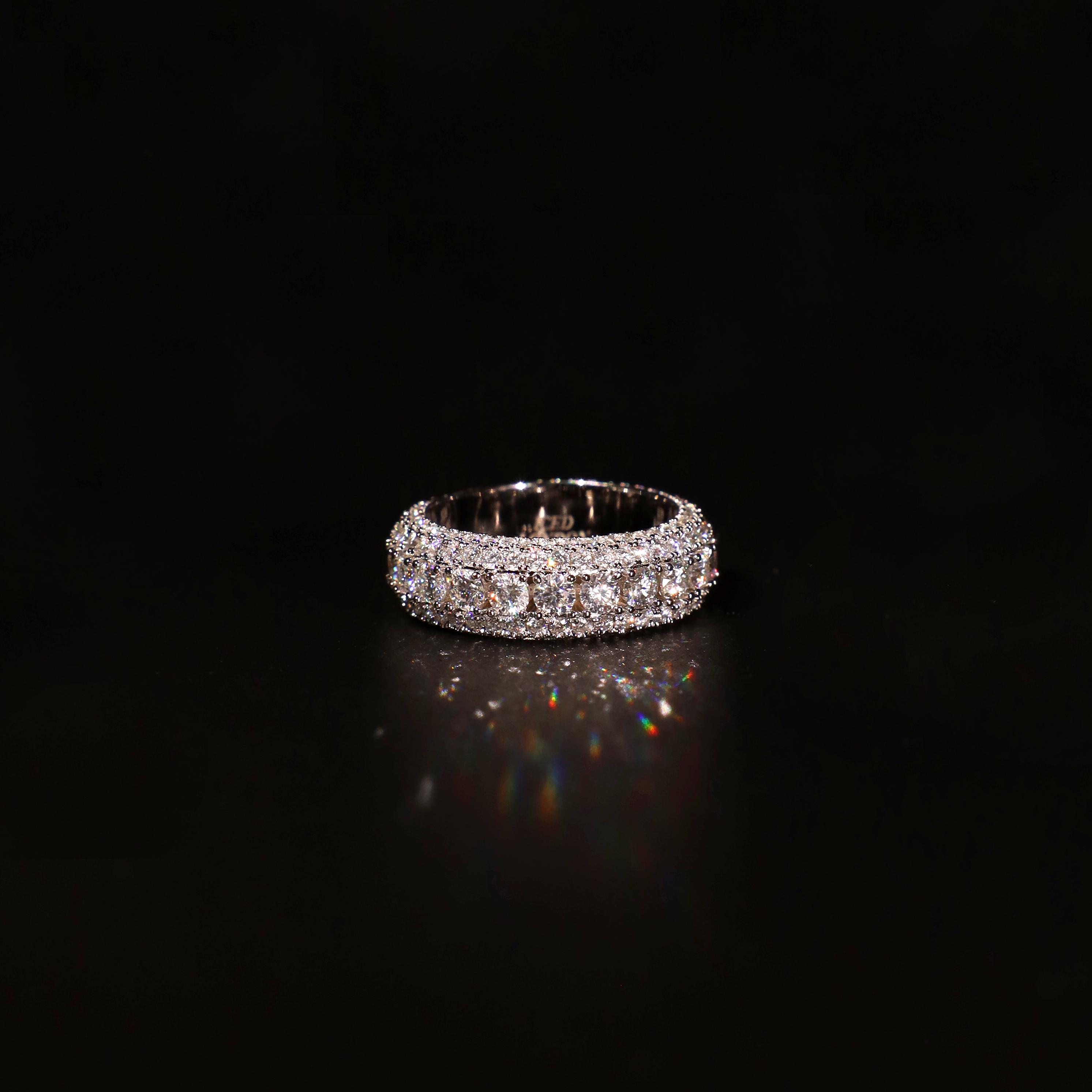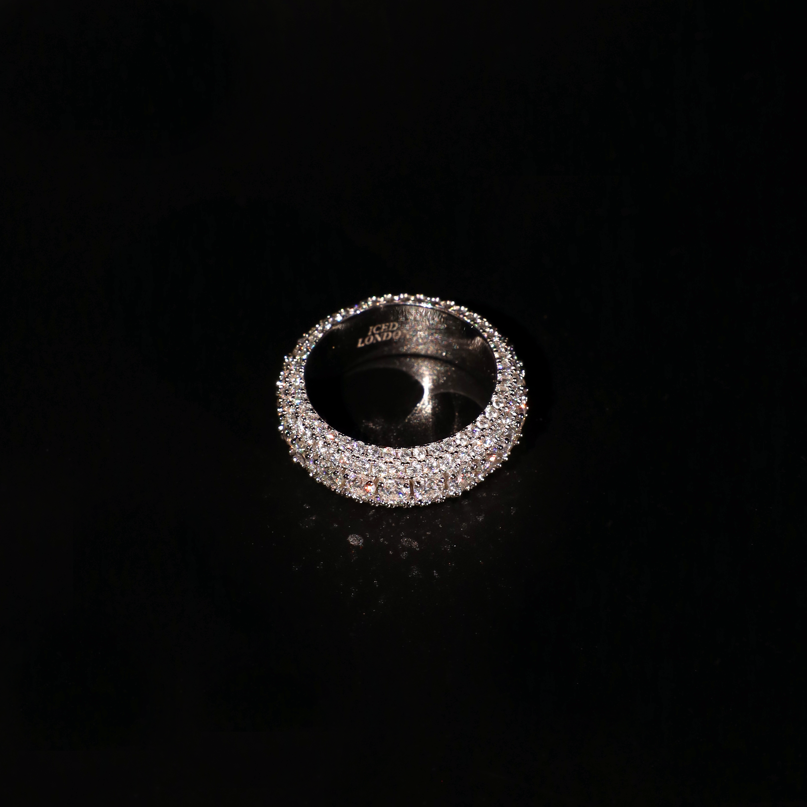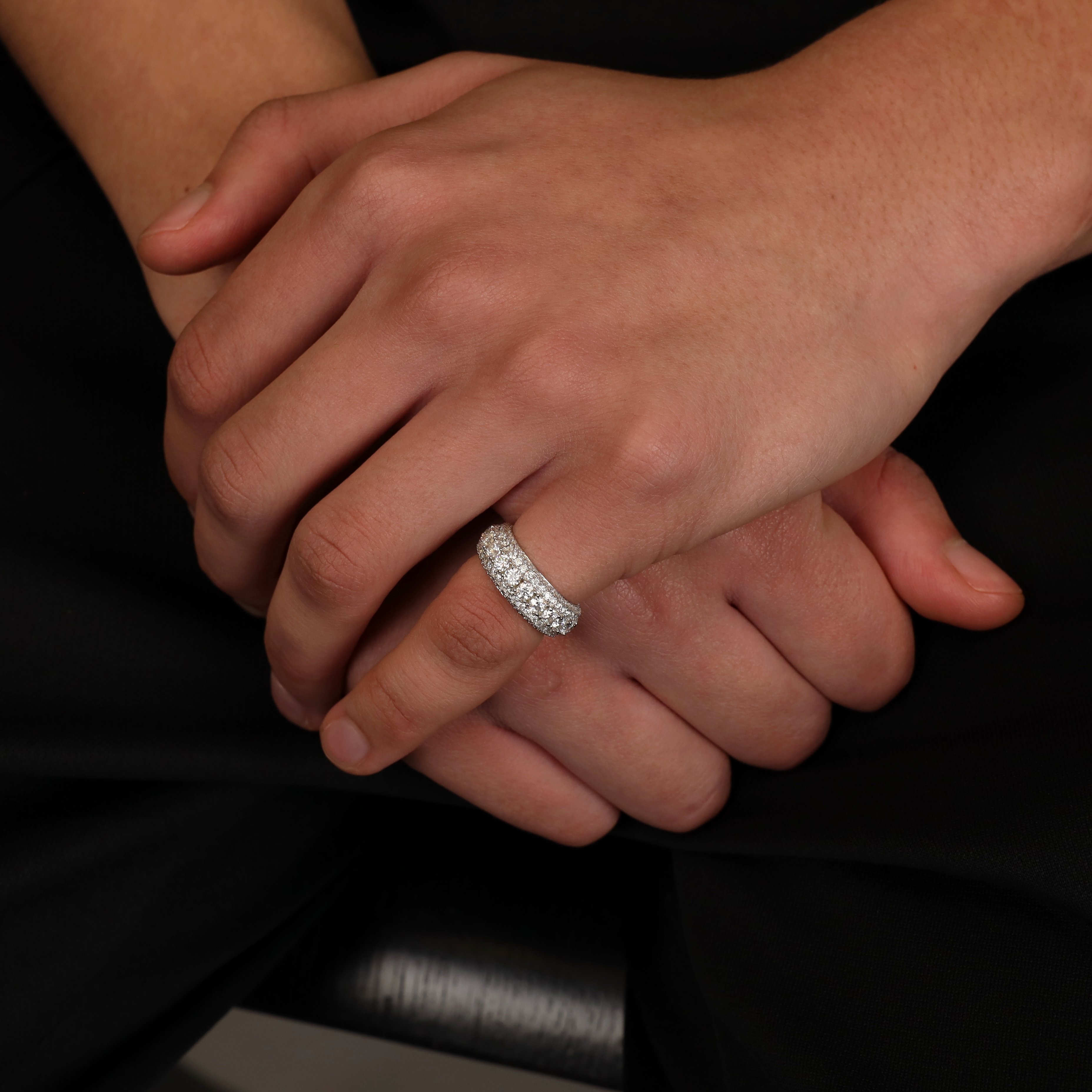 The 5-Row Band Ring is engineered for those who seek presence and power in their jewellery. Featuring a dynamic blend of pavé and prong-set stones, its multi-dimensional structure catches and reflects light from every angle. The central row of bold round-cut stones is framed by intricate pavé detailing, enhancing depth and intensity. With a 9.4mm width and a robust yet comfortable fit, this piece asserts itself effortlessly. Inside, the ICED LONDON engraving signifies authenticity, marking it as a creation of uncompromising quality. A ring not just to wear but to own—a symbol of status, ambition, and distinction.