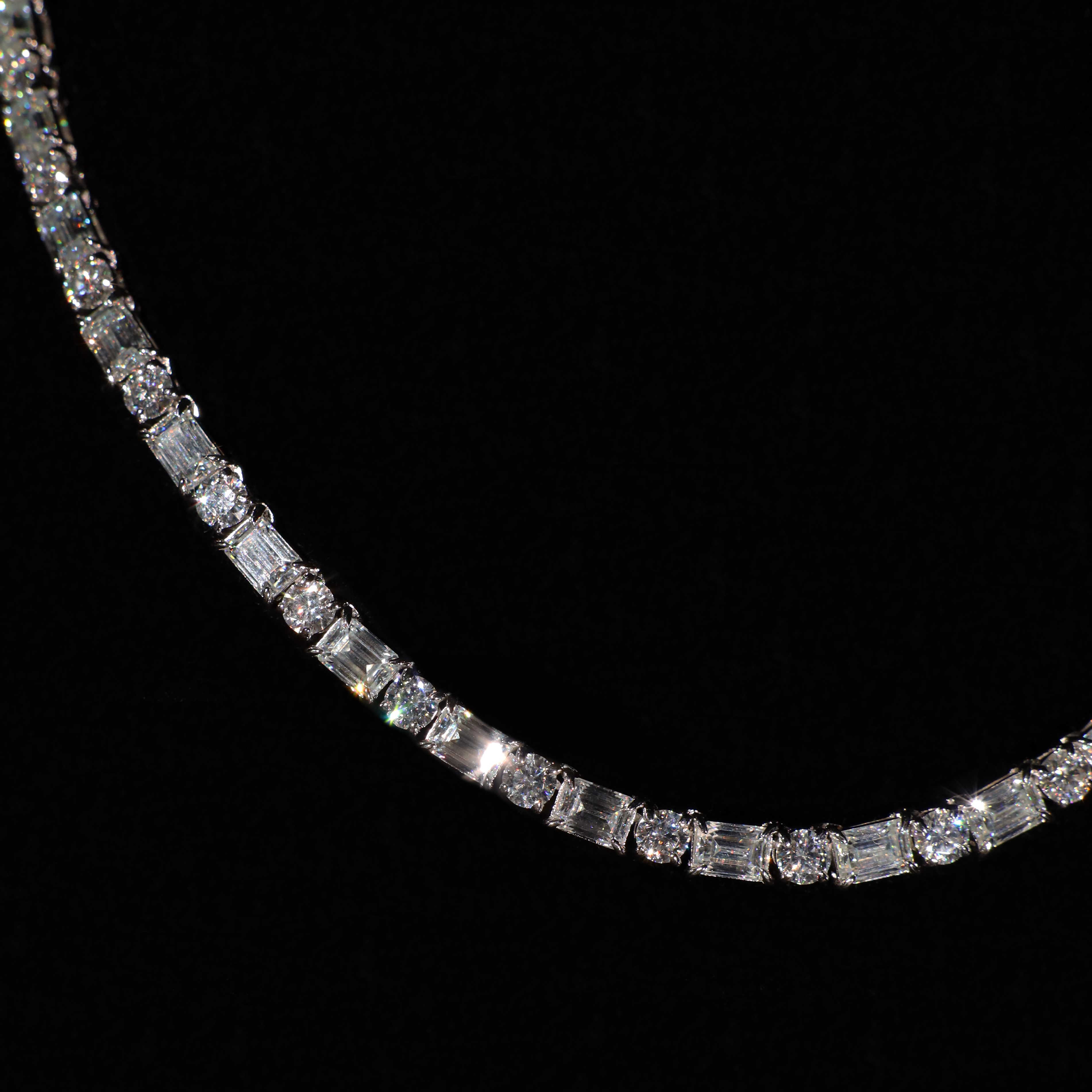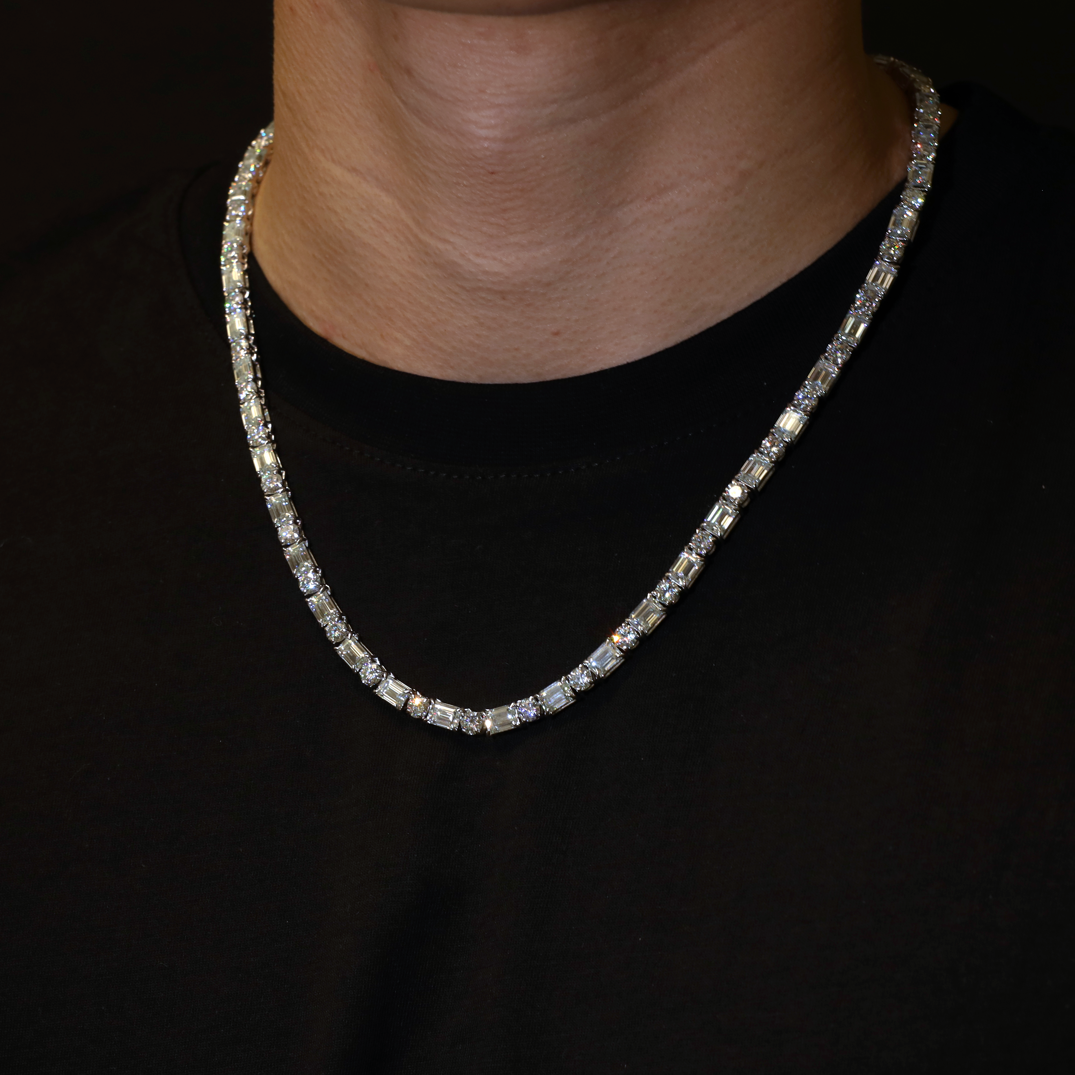 The 5mm Round & Emerald Tennis Necklace is a masterful fusion of classic and contemporary design, seamlessly blending the brilliance of round-cut stones with the refined elegance of emerald-cut stones. A sophisticated statement piece that embodies pure luxury.