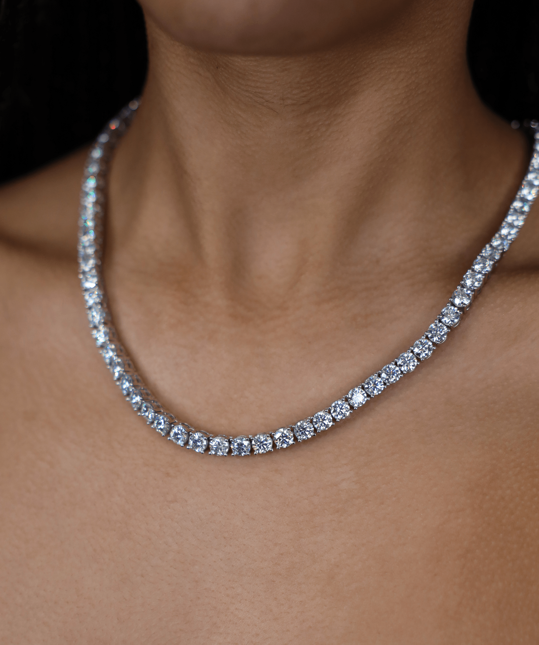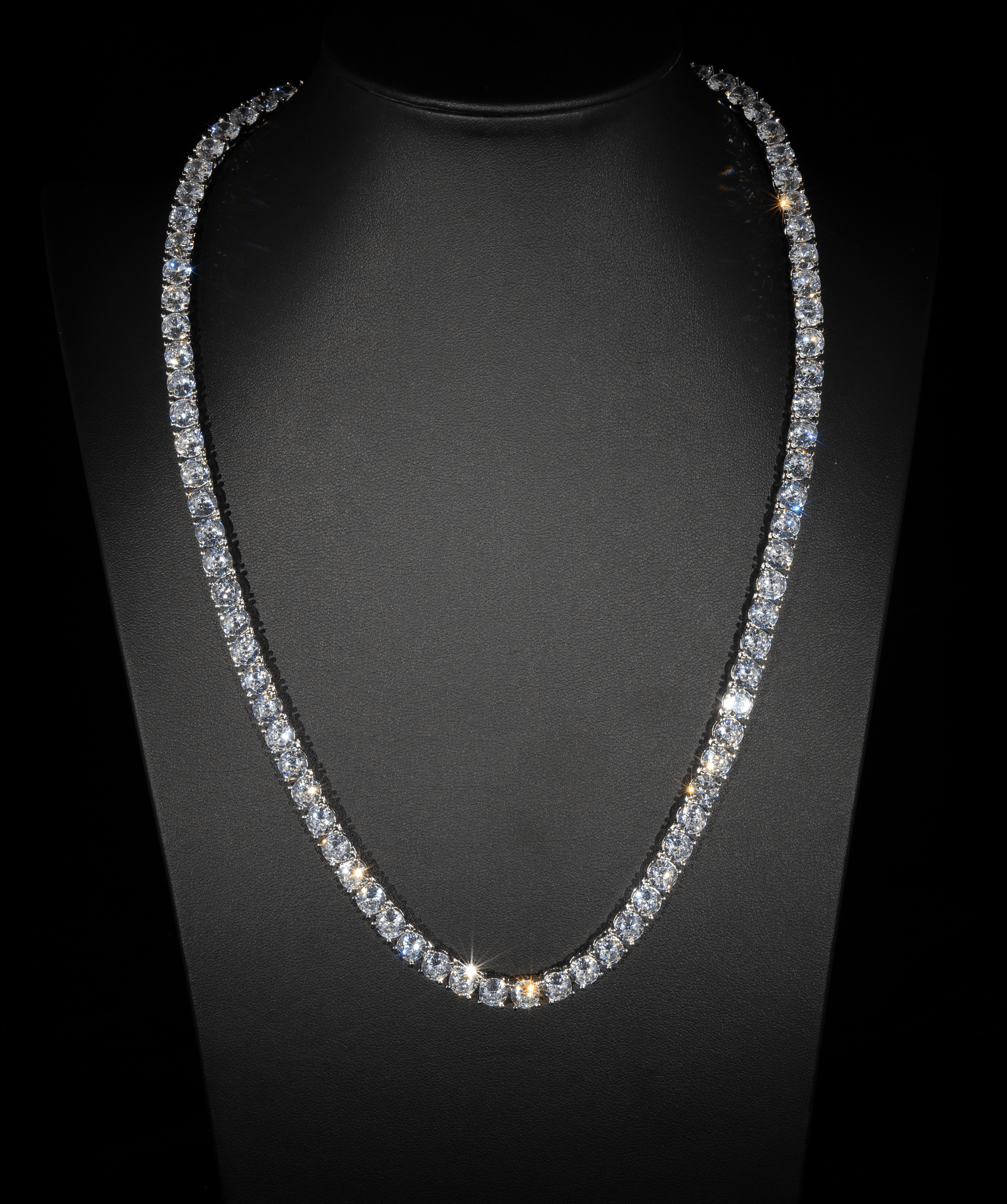 A staple of status and style, the 6mm Tennis Necklace delivers unrelenting shine with its perfectly aligned round-cut stones. Each link is precision-set to create a seamless flow of light, ensuring maximum radiance at every angle. Designed for those who appreciate both craftsmanship and presence, this piece offers a balance of weight and comfort, allowing it to sit effortlessly on the neck. The secure clasp ensures durability, making it a statement that lasts beyond the moment.