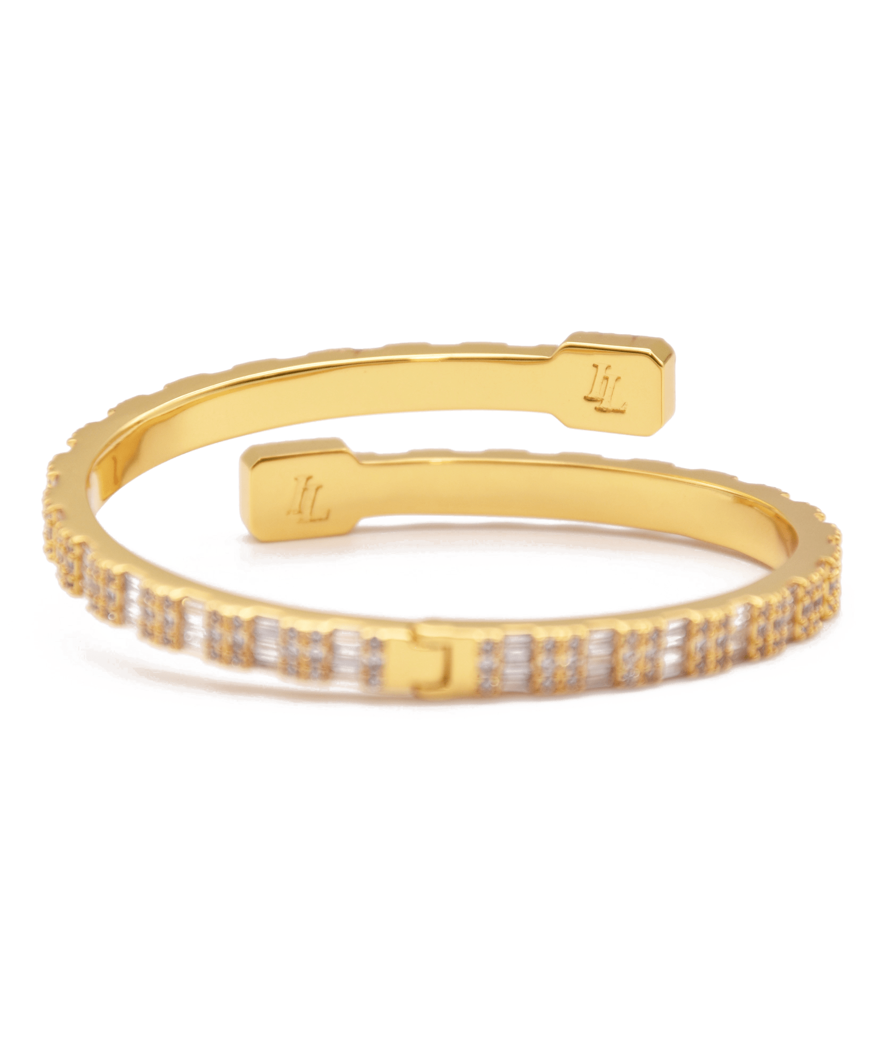 This Iced London Unisex Baguette Bangle is made from real 18k gold, featuring over 90 hand-selected baguette stones and over 240 brilliant round-cut stones, guaranteed to upgrade any fit.