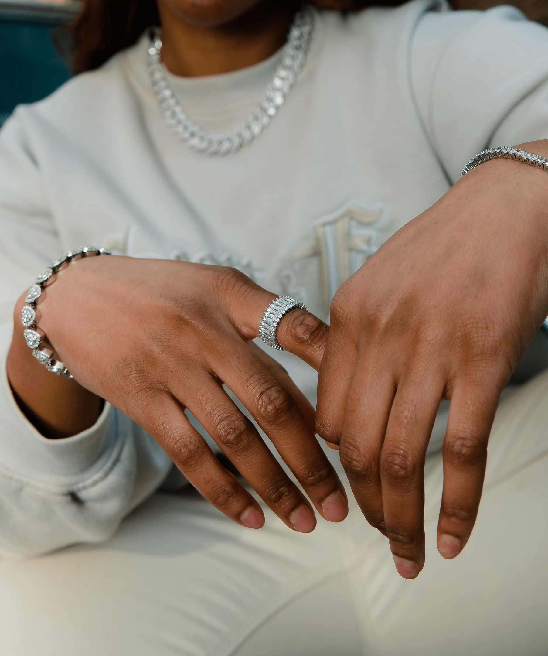 Our Baguette Ring features baguette stones hand-set throughout the centre of the entire ring, with two rows of singular round-cut stones prong-set on either side.