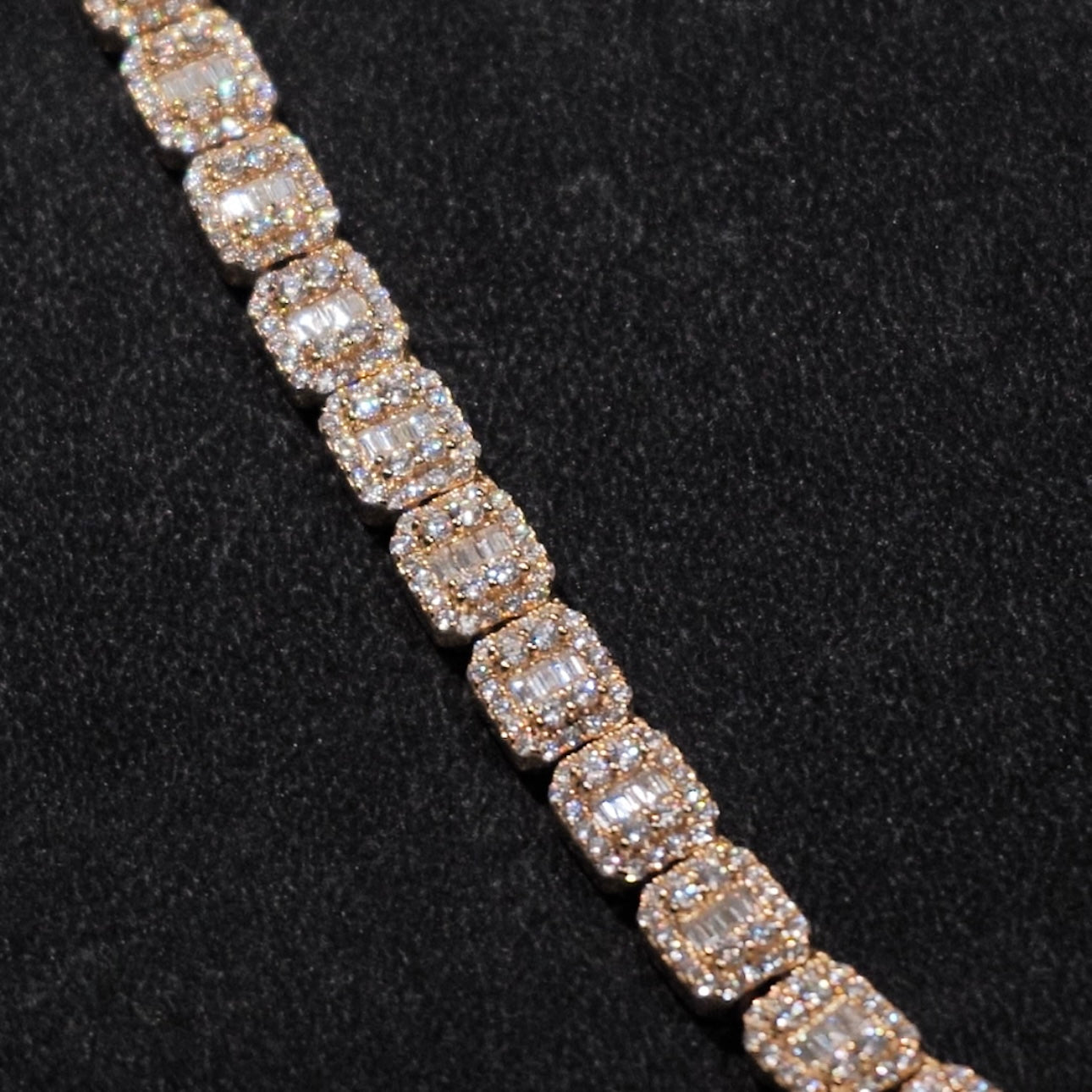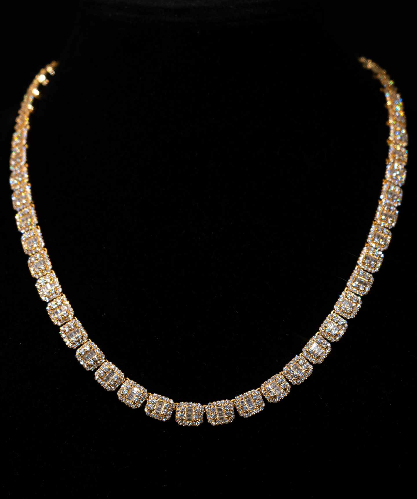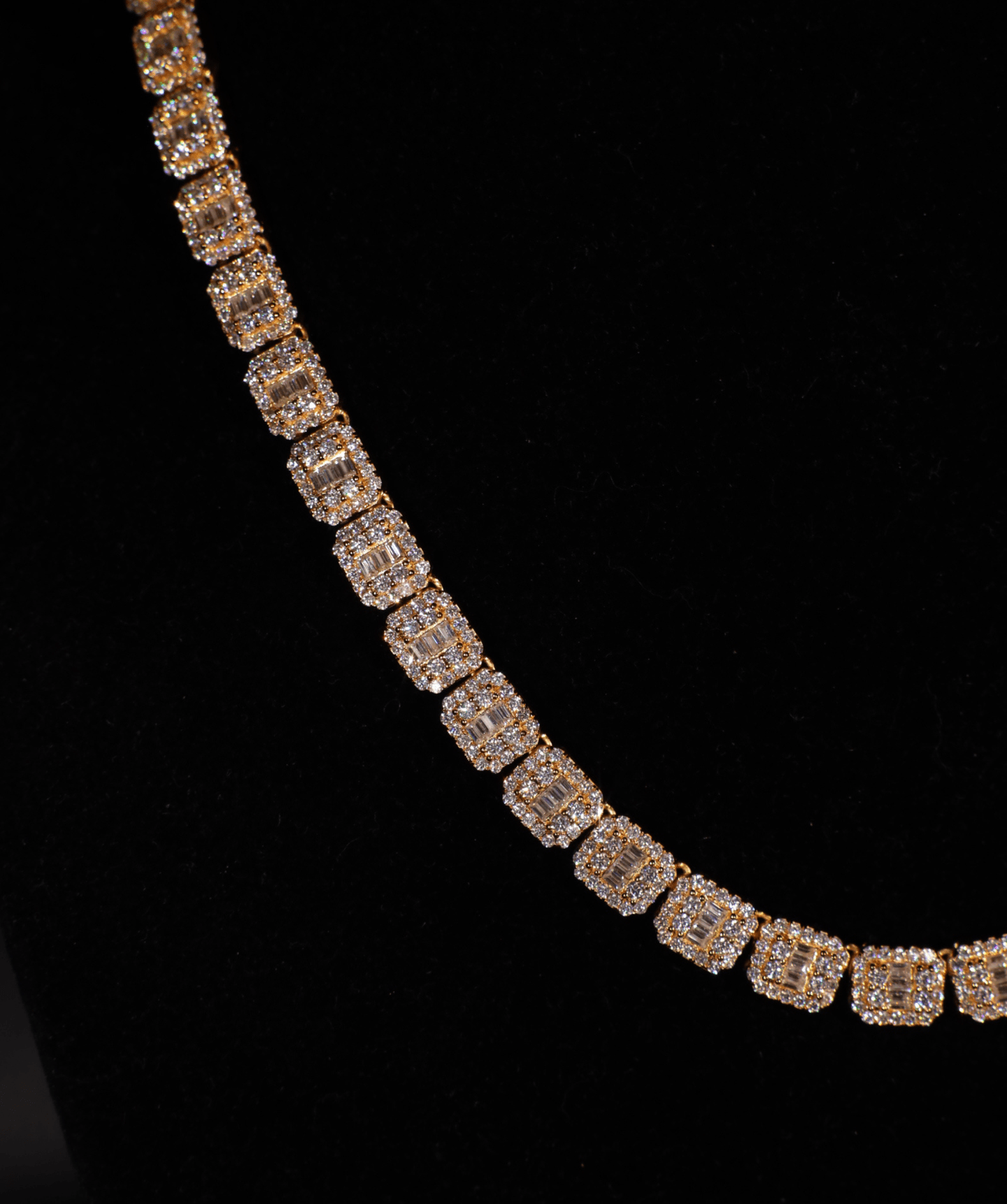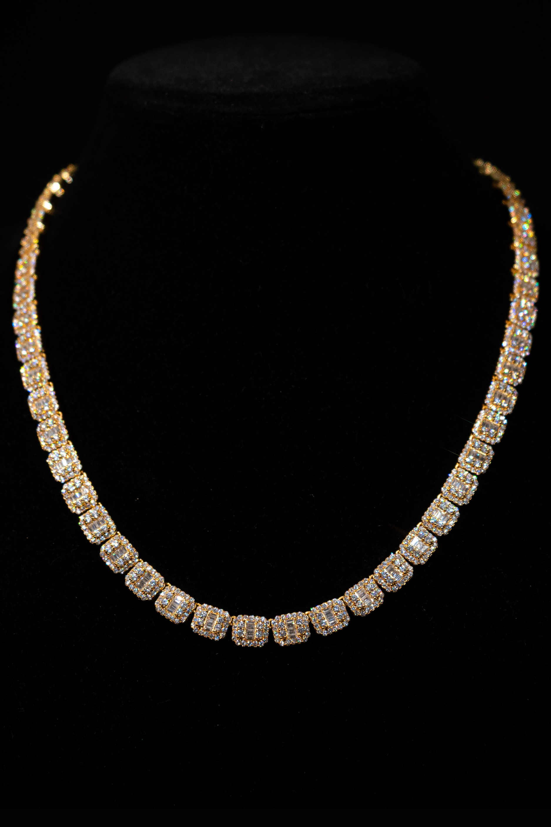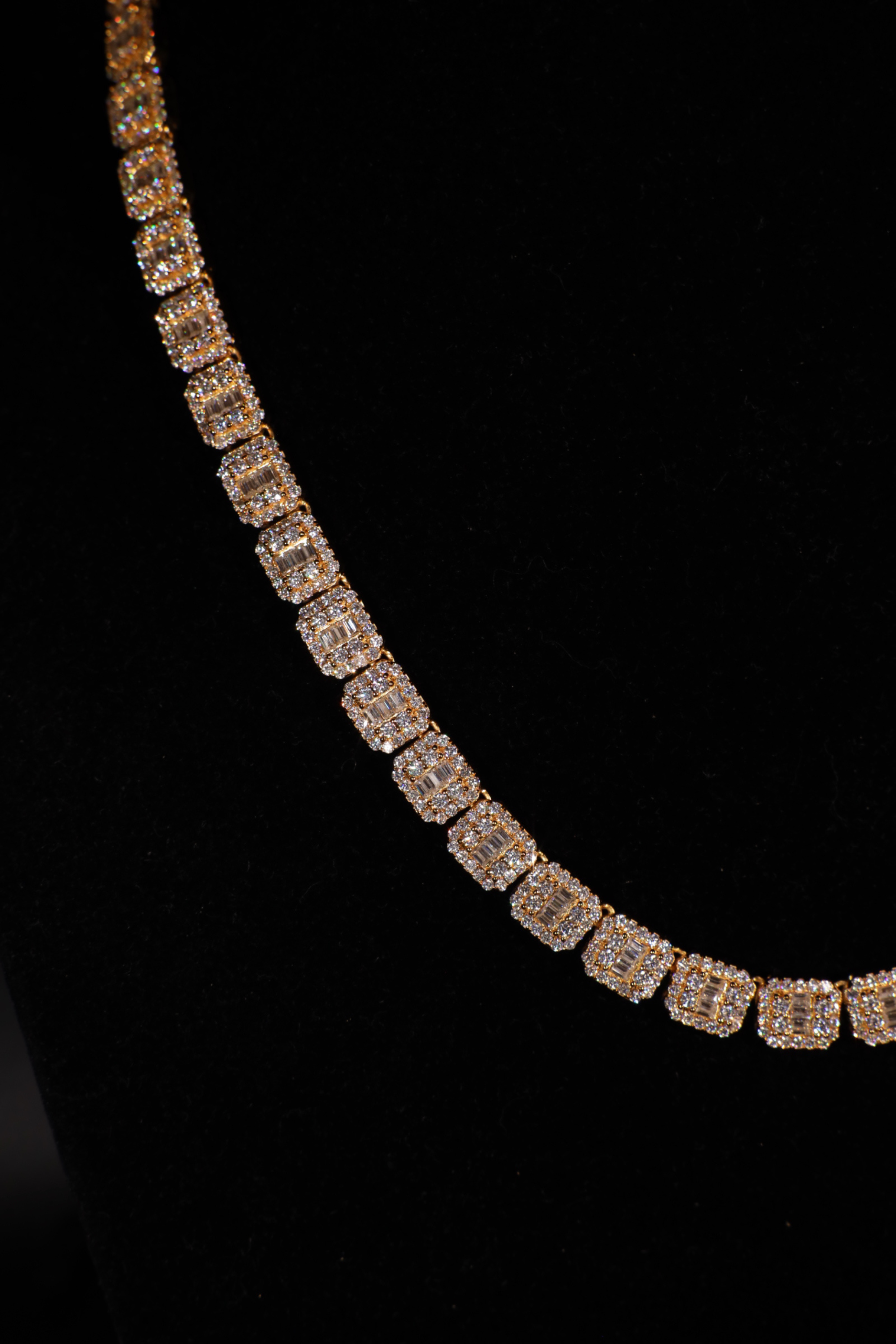 A bold fusion of structure and brilliance, the Baguette Square Link Necklace delivers a commanding presence with its meticulously arranged square links. Each segment is encrusted with a fusion of round and baguette-cut stones, forming a continuous sequence of light-catching brilliance. This 8mm-wide masterpiece balances contemporary design with classic refinement, offering a striking yet wearable piece that enhances any look. Built for those who appreciate craftsmanship, its seamless articulation allows effortless drape and movement, ensuring it sits perfectly on the neckline.