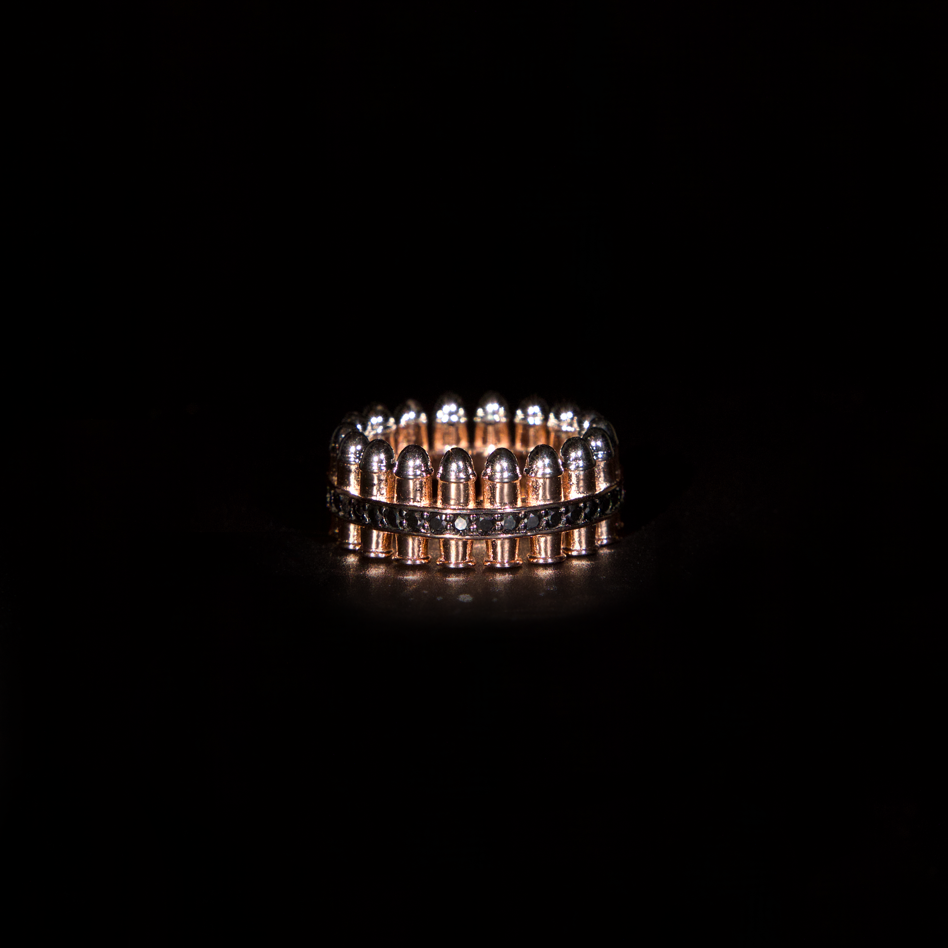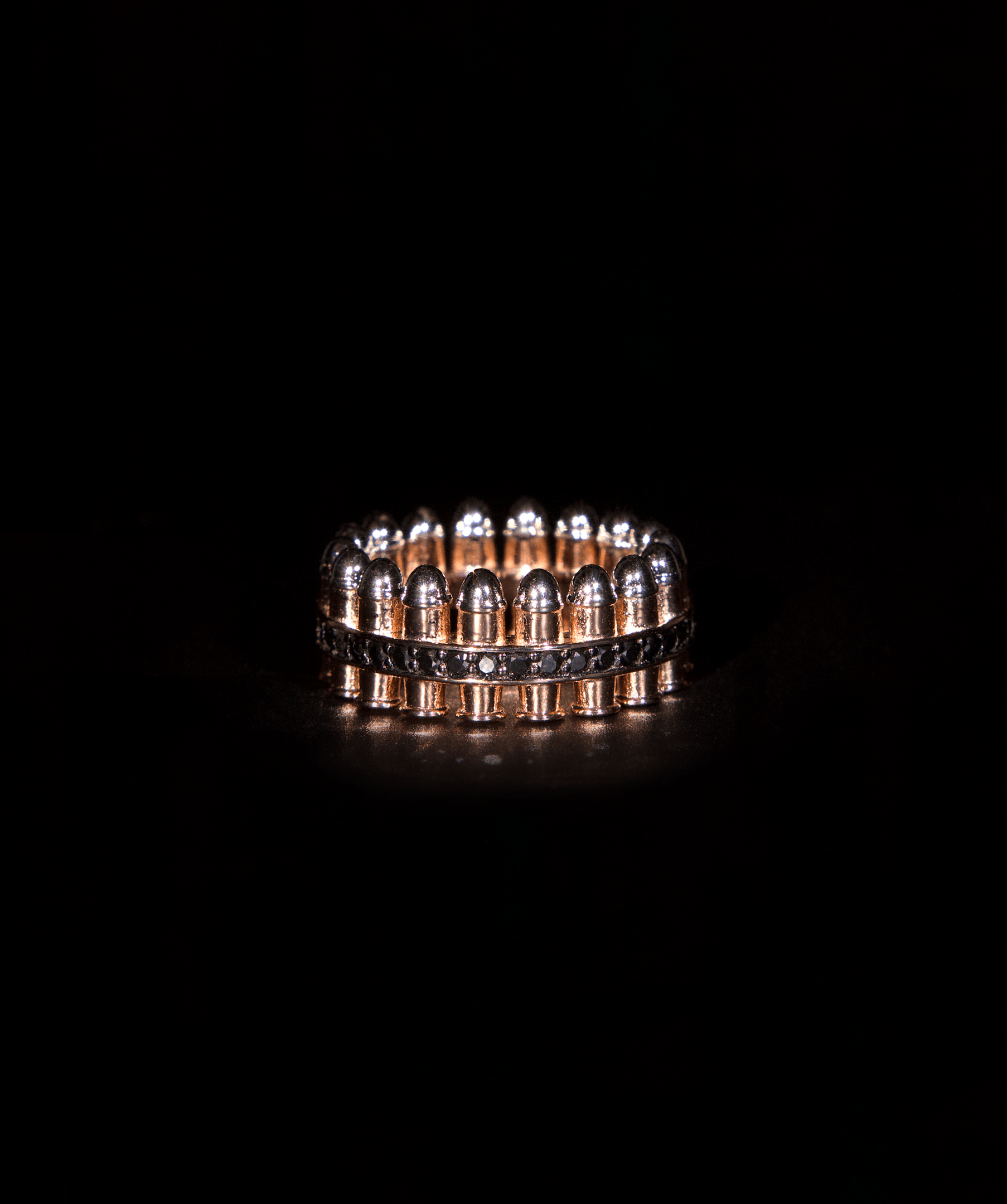 The Bullet Ring is a fearless statement of power and precision, merging avant-garde design with impeccable craftsmanship. Encircling the finger with meticulously sculpted bullet motifs, this bold piece is elevated by a row of black diamonds, creating a striking contrast against its rich gold setting.