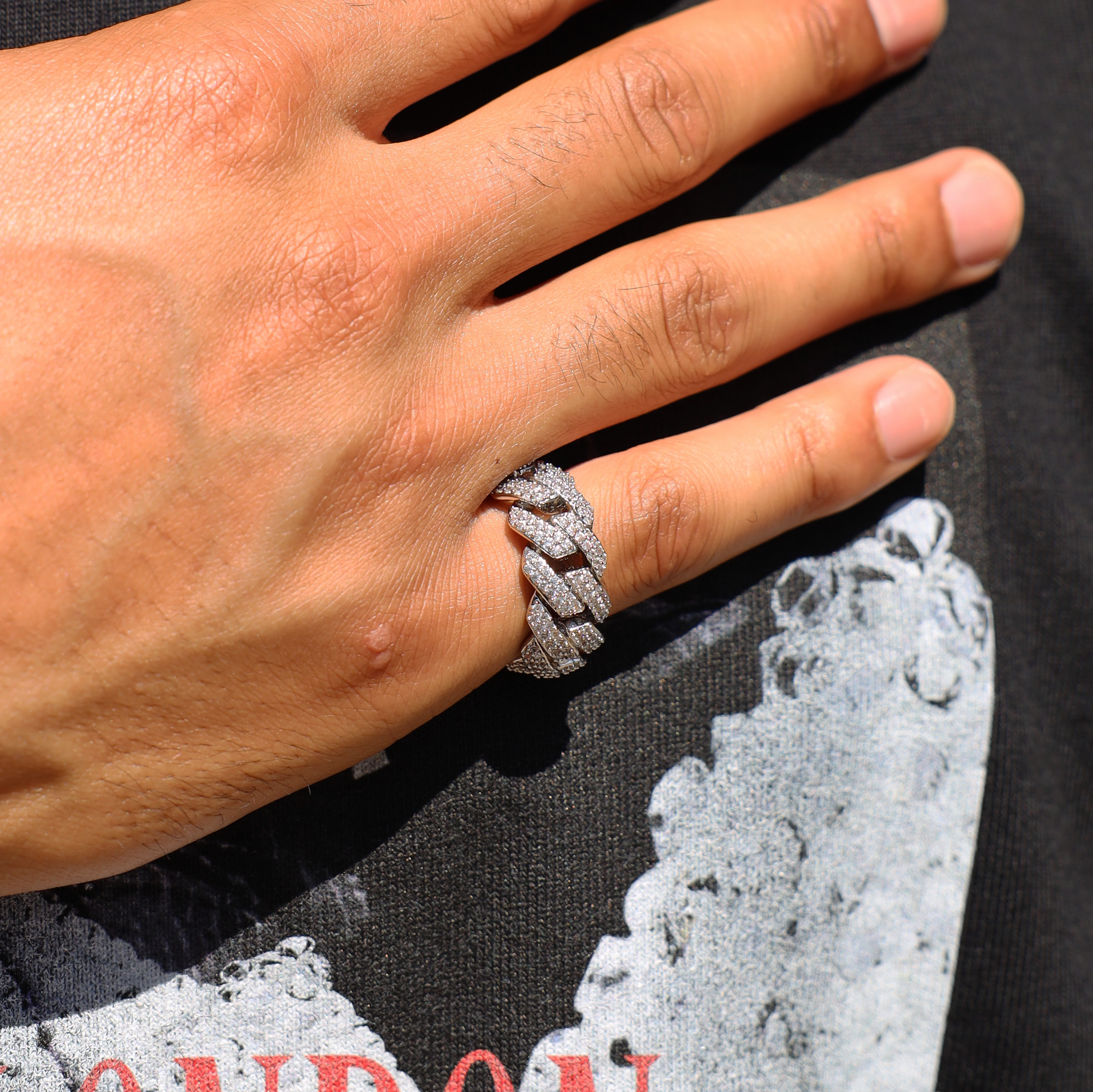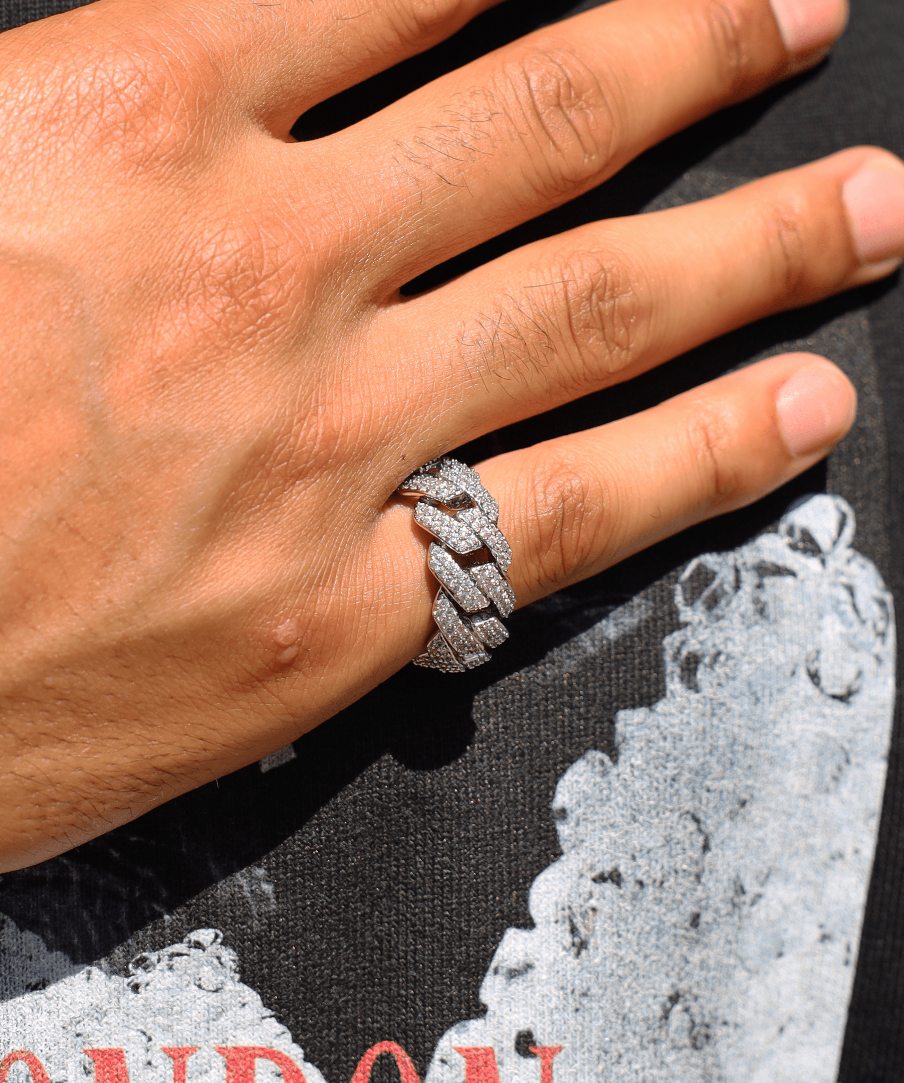The Cuban Link Ring is an evolution of the iconic chain, translating its unmistakable silhouette into a fully iced band. Crafted from 925 sterling silver, each meticulously set stone enhances the dynamic structure, ensuring the ring shines from every angle. The interlocking links symbolise strength and connection, making it more than just jewellery—it's a signature of confidence and presence.