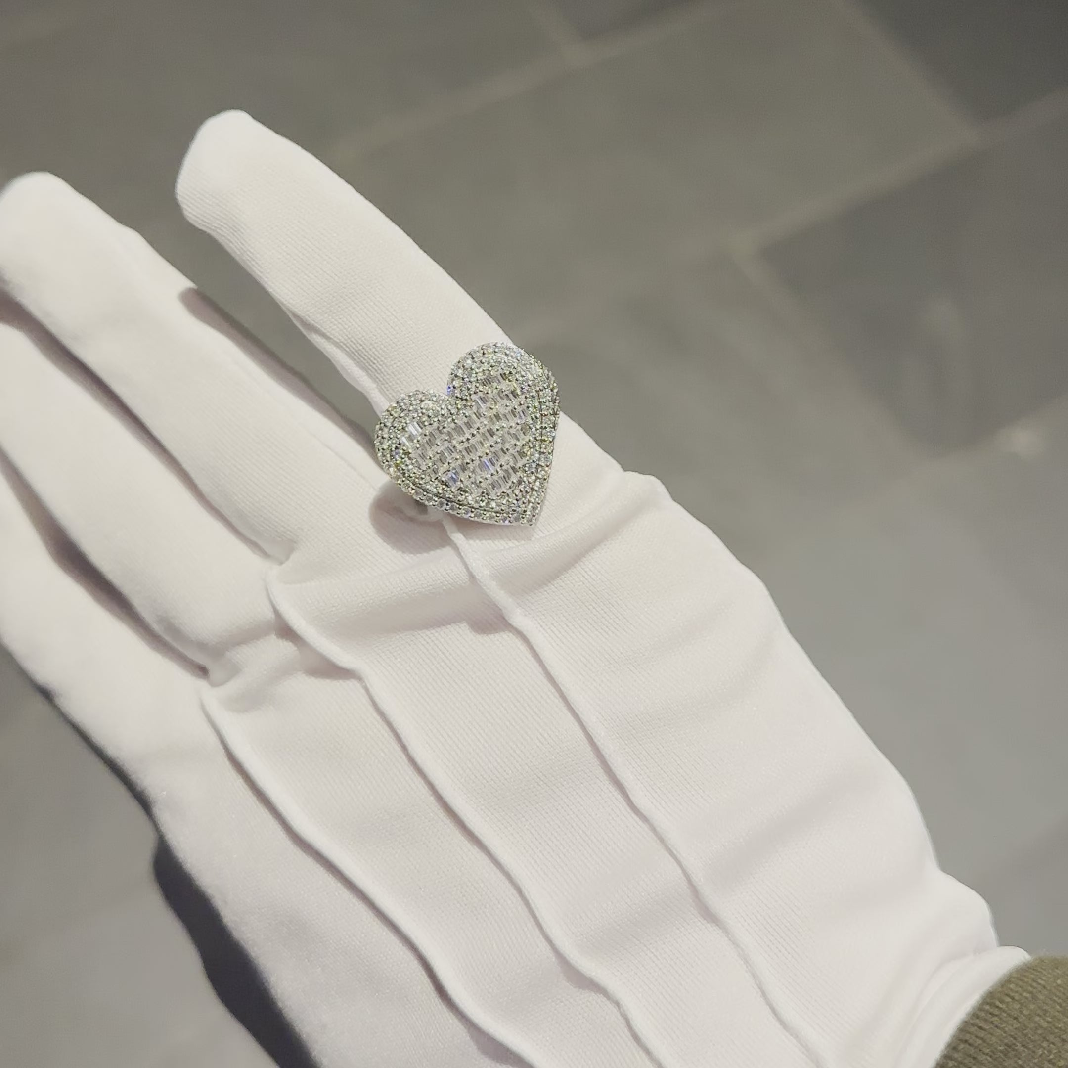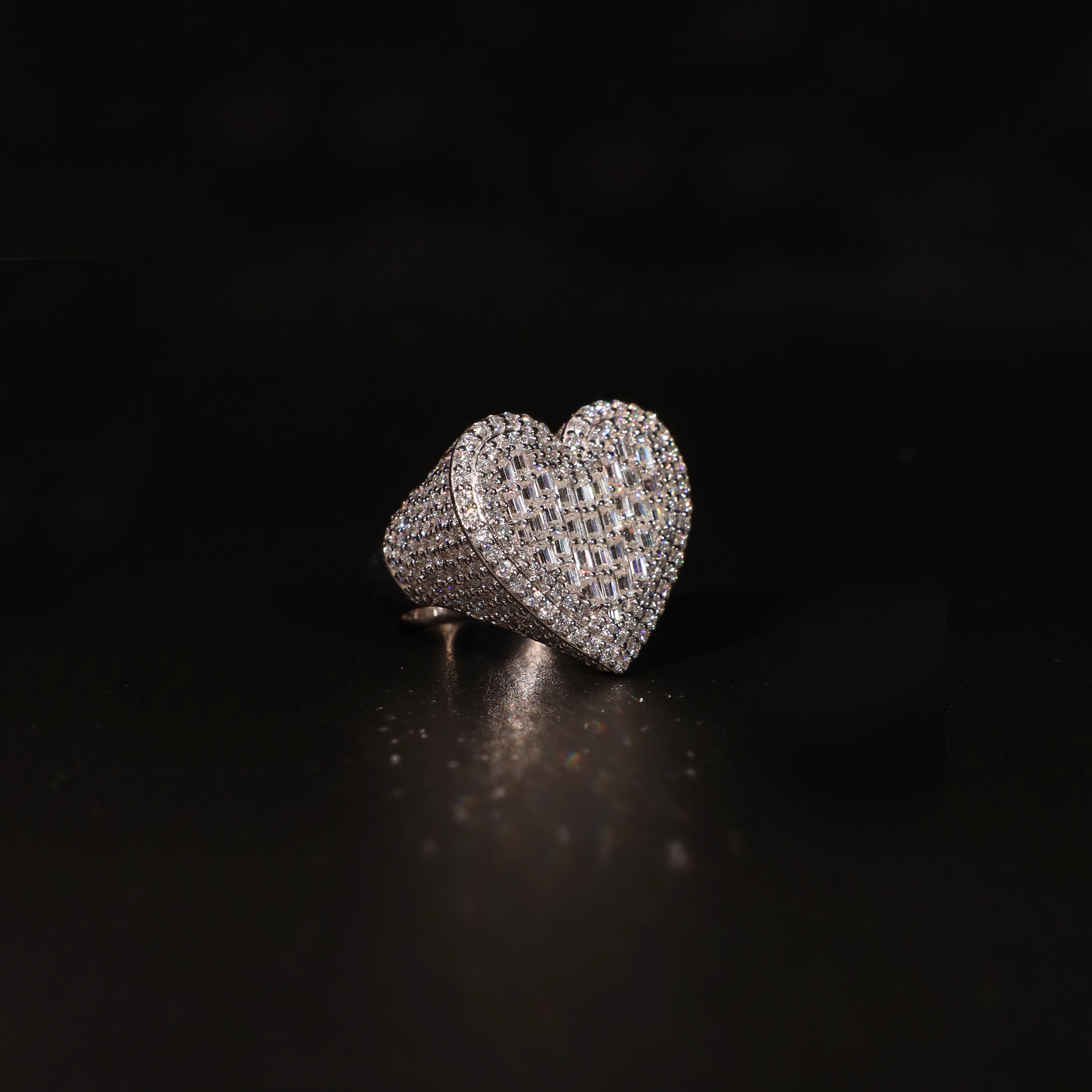 The Silver and VVS Moissanite Emerald Heart Ring. Made with 925 Silver, this ring is not only durable and long-lasting, but also adds a touch of luxury to any outfit. The ring features a beautiful emerald-cut VVS Moissanite at the center, surrounded by a heart-shaped design, adding a touch of romance and sparkle to the ring.