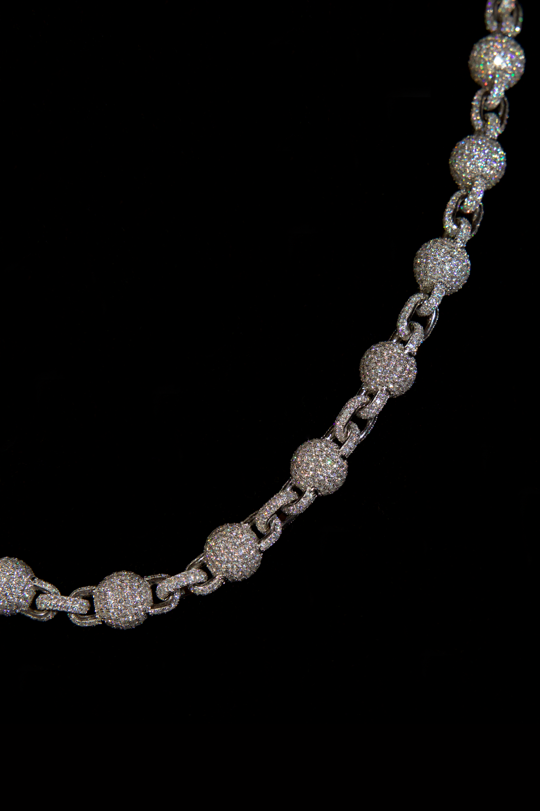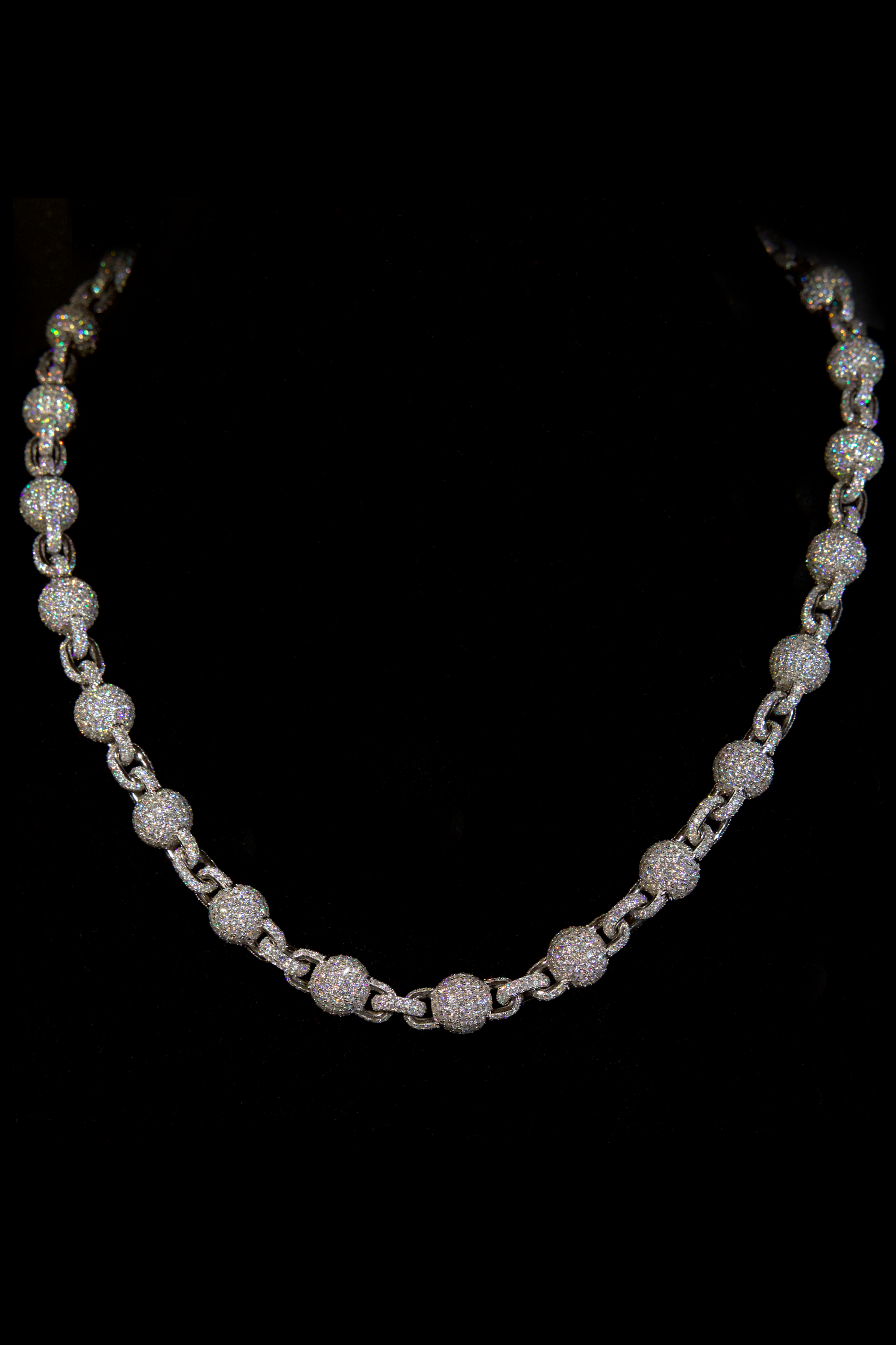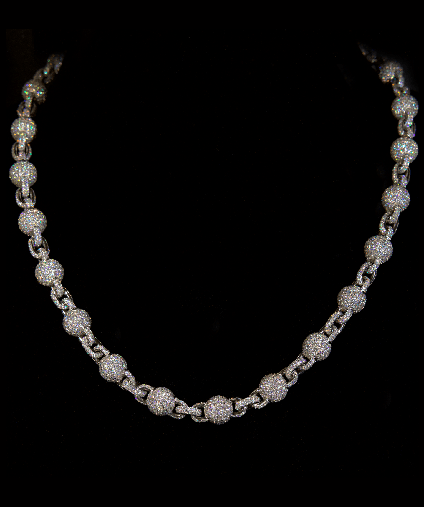 A piece that leaves nothing untouched. Every ball, every link, fully flooded to create an unbroken flow of light. A step beyond traditional chains, this design blends structure with brilliance, delivering a look that is both distinctive and commanding.