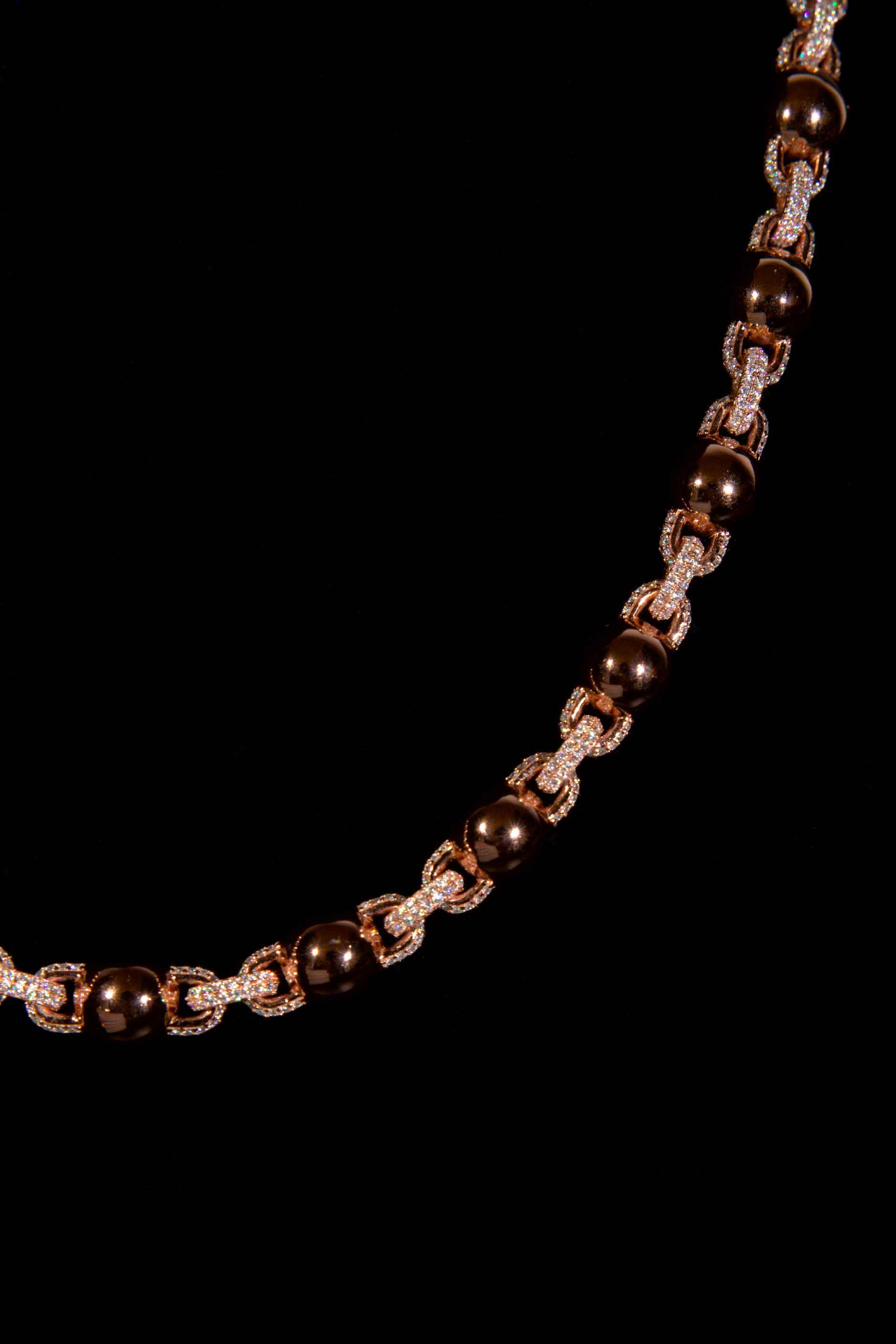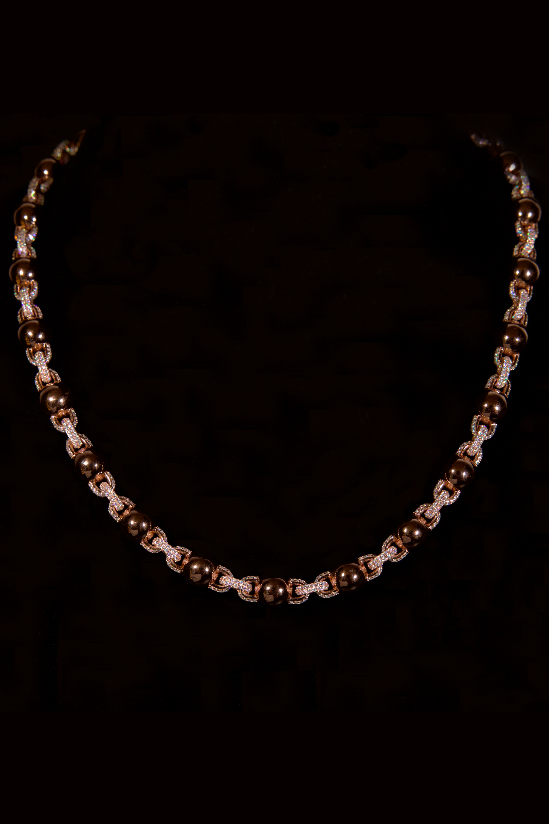 A fusion of contrast and balance, the half set ball chain blends smooth, polished spheres with meticulously set interlocking links. The play between solid metal and iced elements creates a bold yet refined piece, made to stand out.