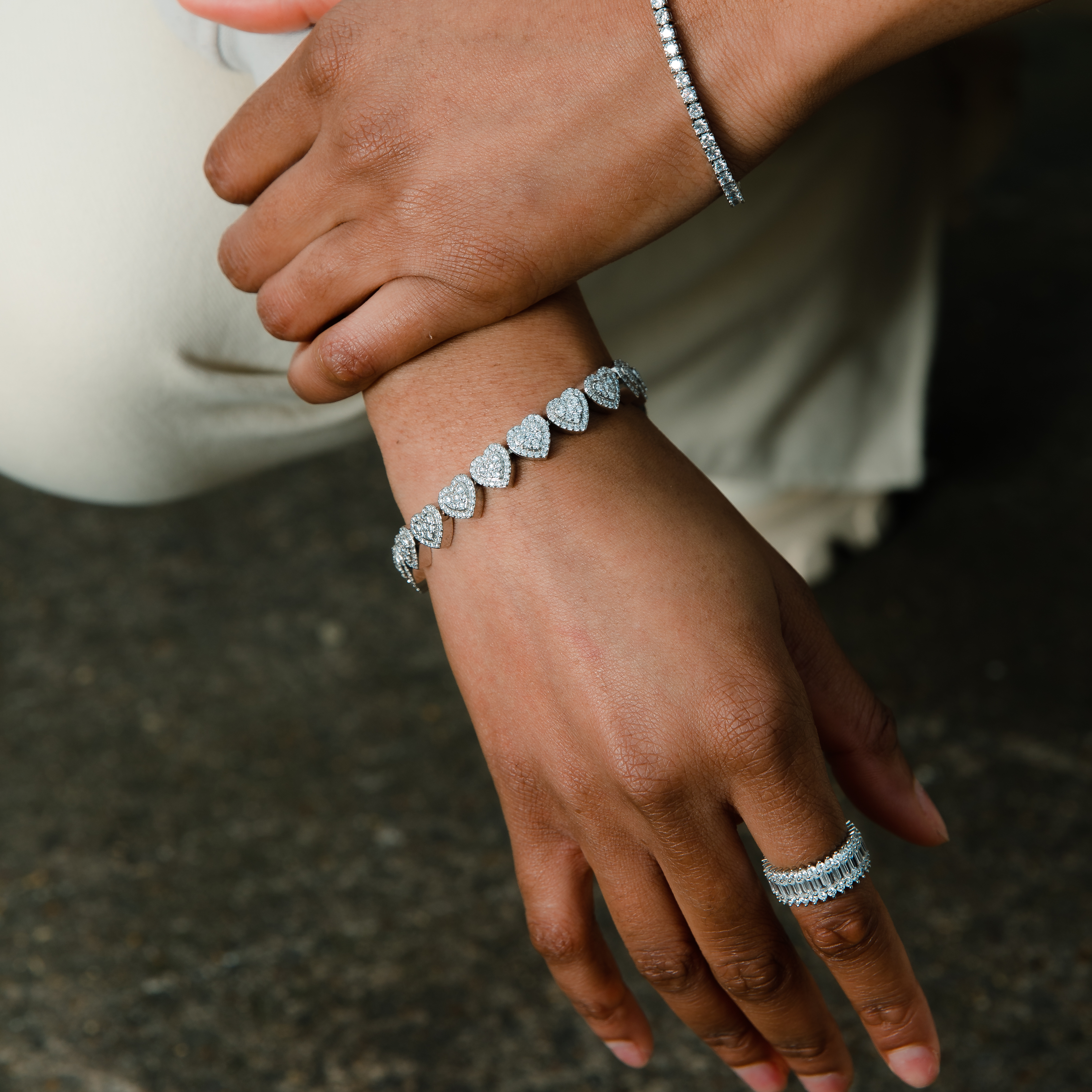 Each heart consists of three centre stones within a single-row border of stones, designed to capture light from all angles.