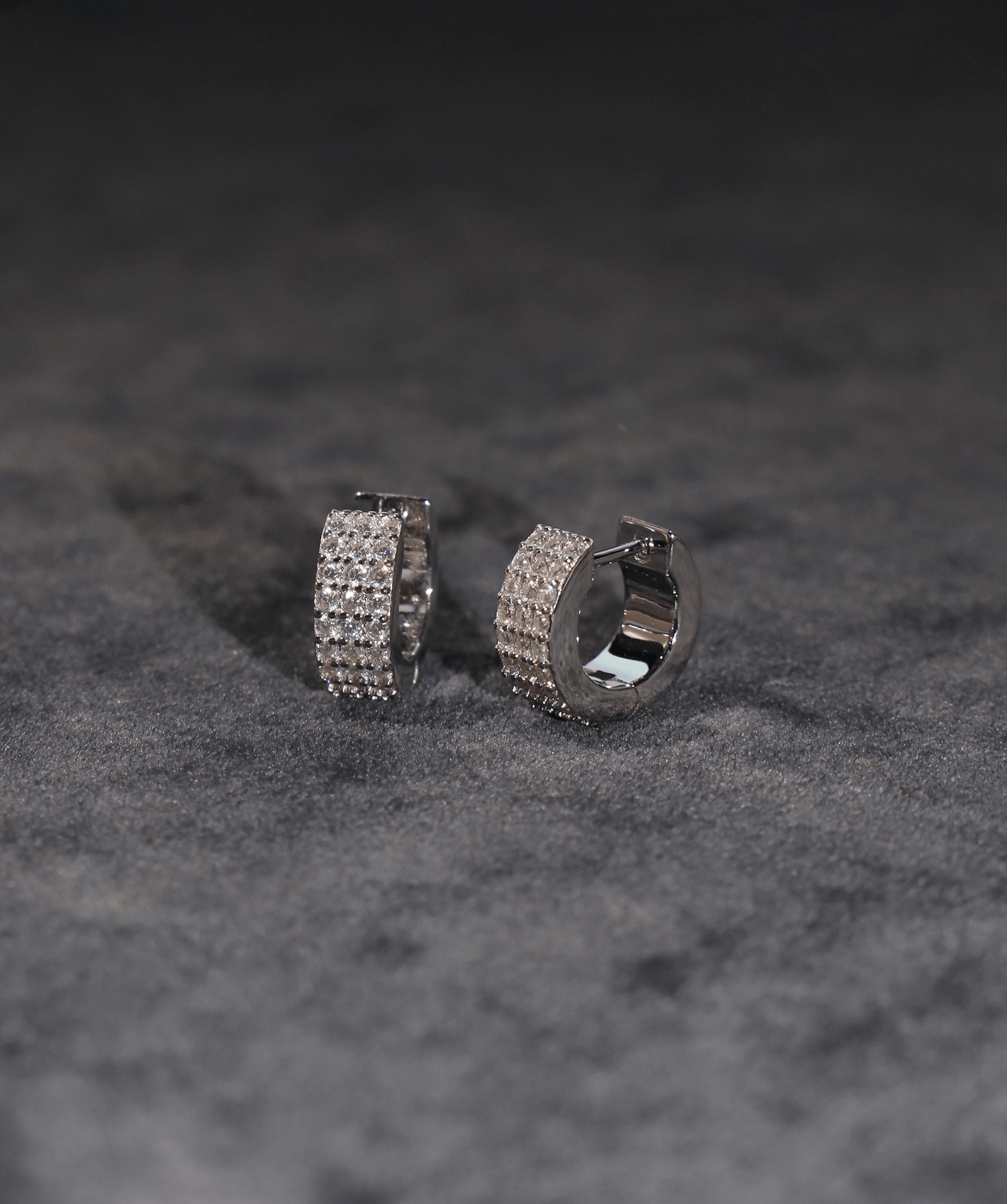 The huggie hoop earrings deliver a balance of structure and shine, crafted in 925 silver with rhodium plating for a lasting finish. Designed for a snug fit against the ear, the triple-row stone setting maximises brilliance while maintaining a sleek, wearable profile. A secure hinge closure ensures ease of wear, making them a versatile addition to any collection.