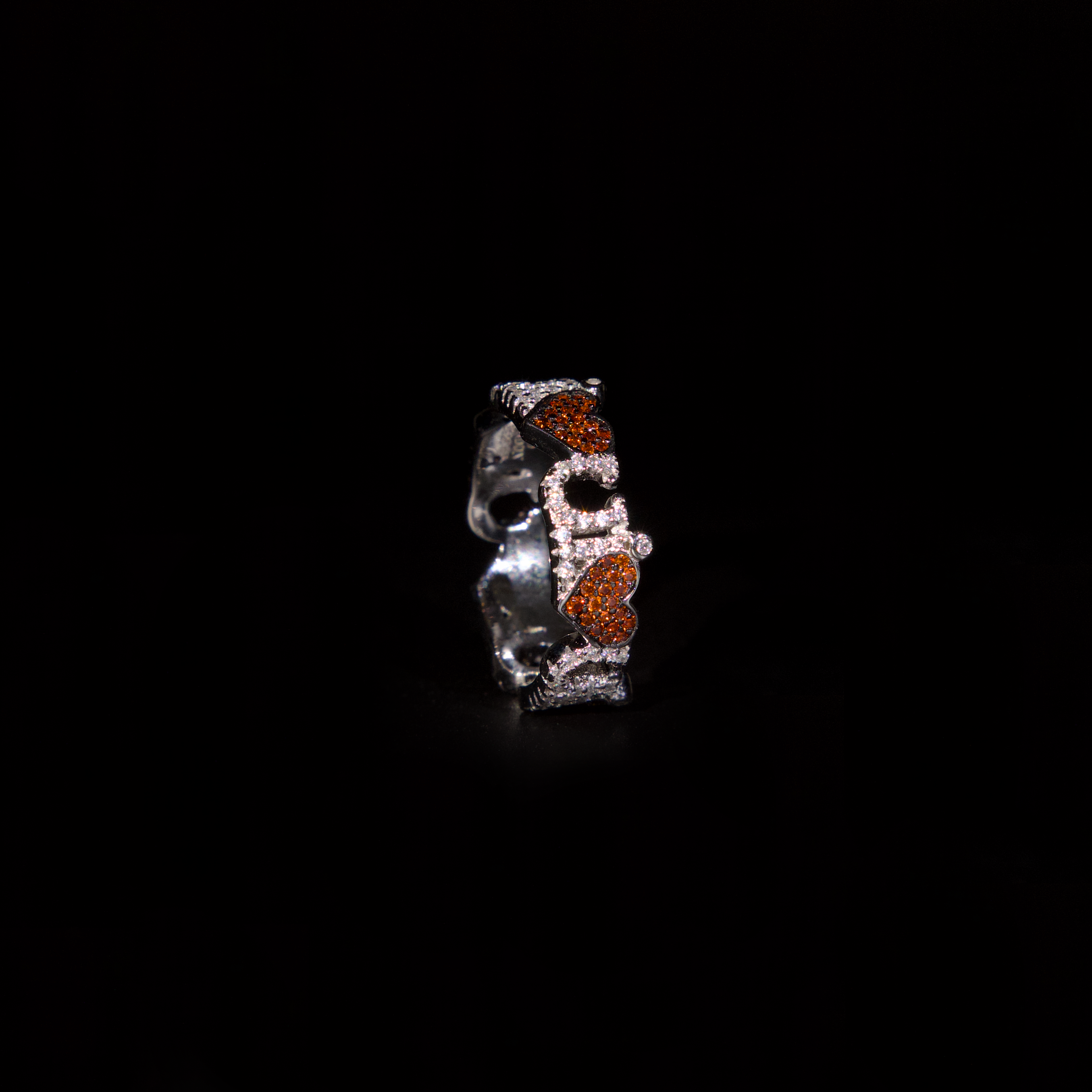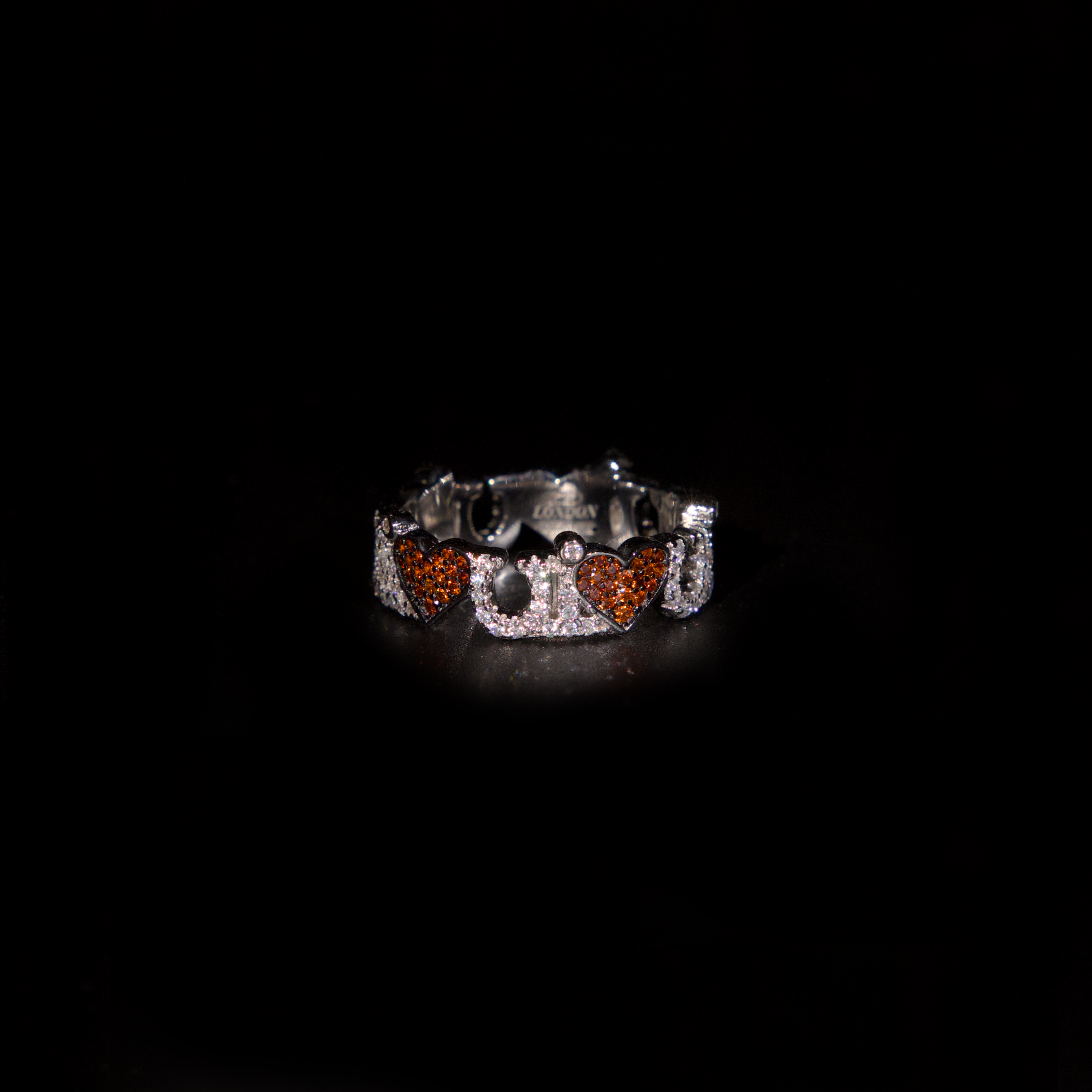 The I Heart U Ring transforms sentiment into an intricate masterpiece, intertwining romance with bold design. Sculpted in solid 925 silver, the continuous band features the phrase "I ♥ U" in an architectural structure. The hearts, ablaze with deep orange sapphires, infuse passion and warmth into this symbol of devotion.