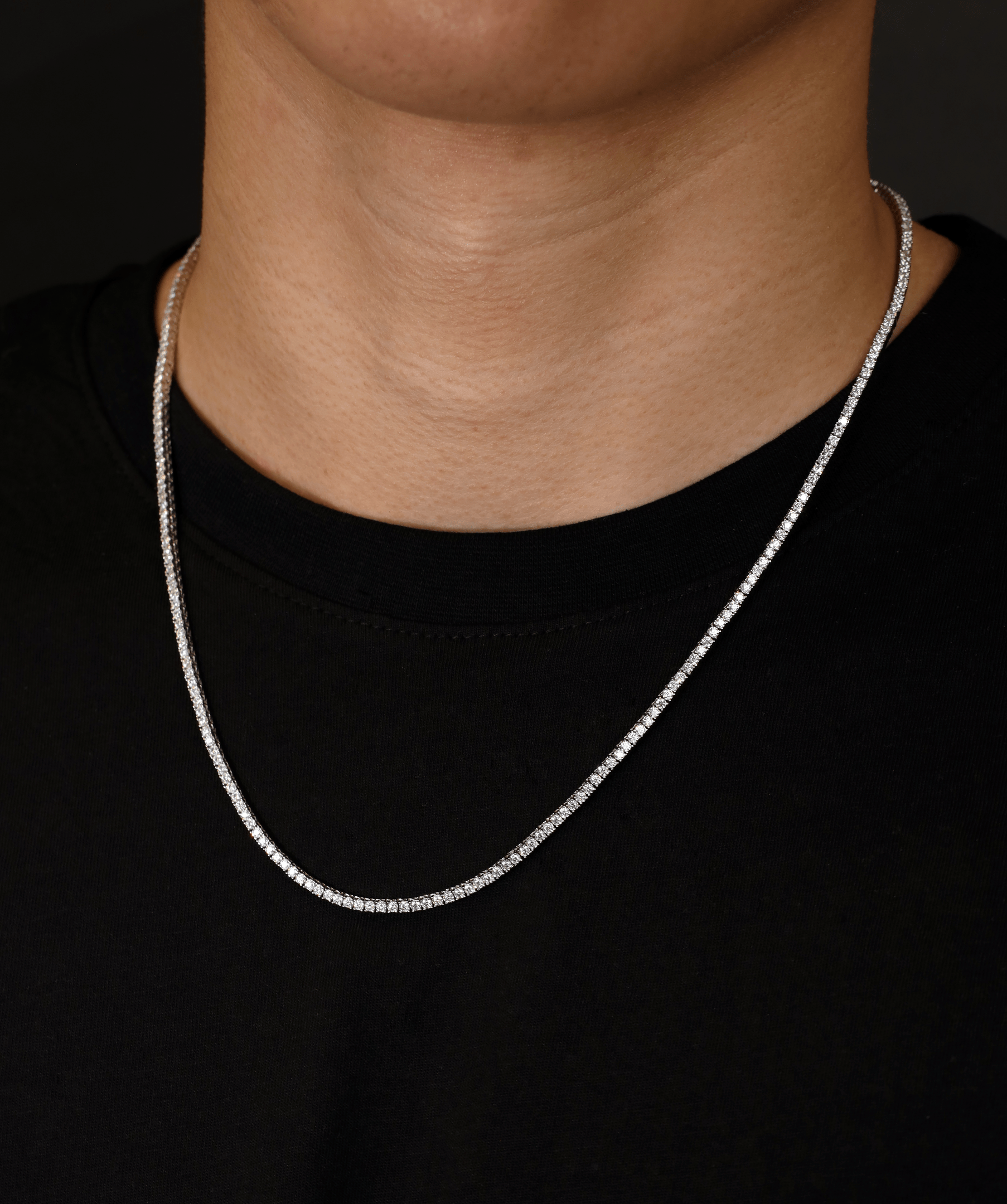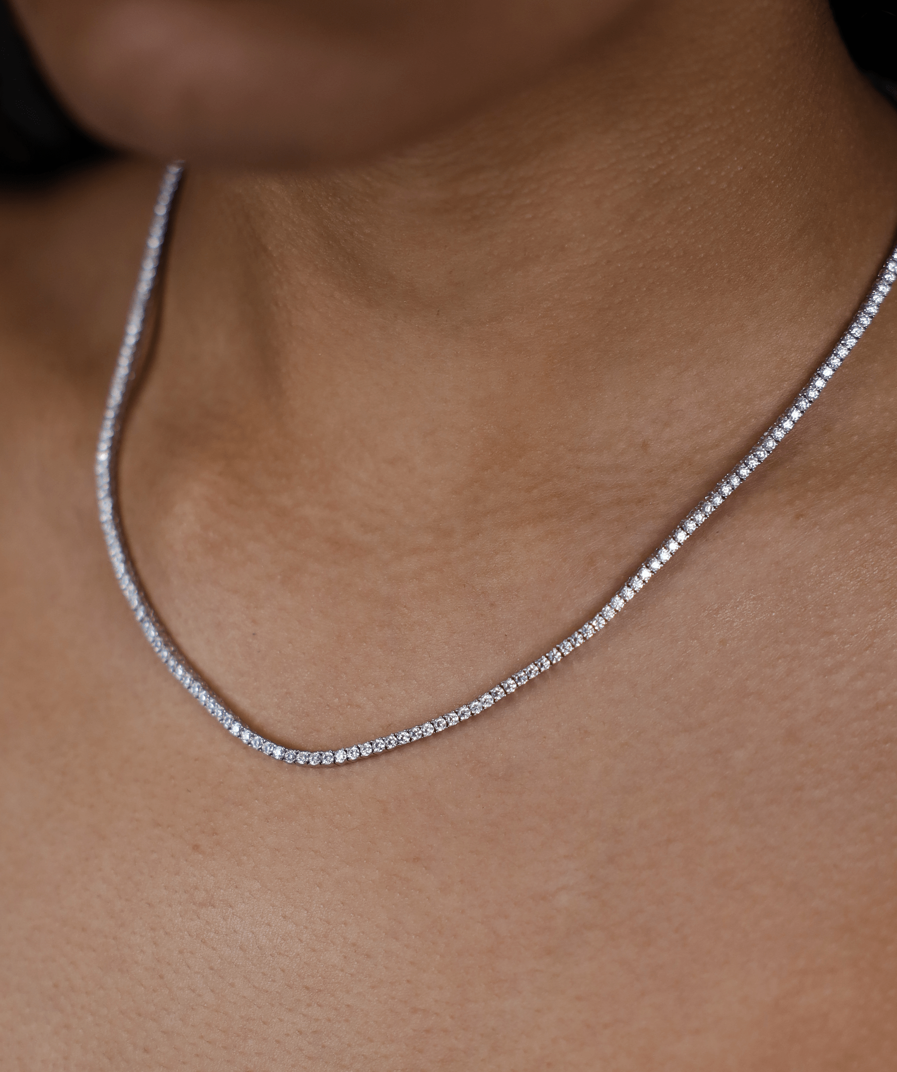 The micro tennis necklace refines the classic design with a subtle 2mm profile, ensuring a clean and understated look while maintaining high brilliance. Hand-set stones create a seamless flow of light, catching the eye without being overpowering. Lightweight and versatile, it transitions easily from everyday wear to elevated occasions.