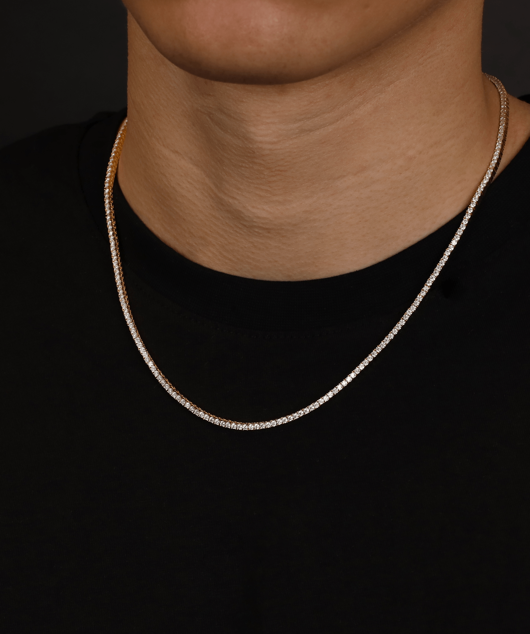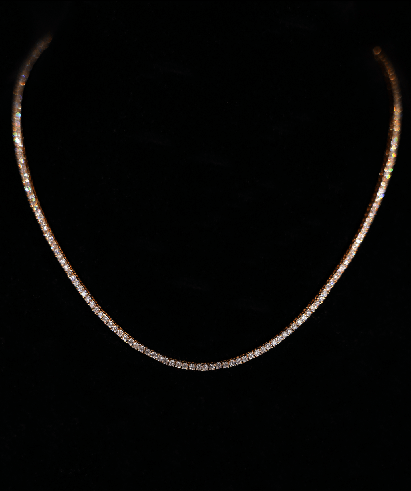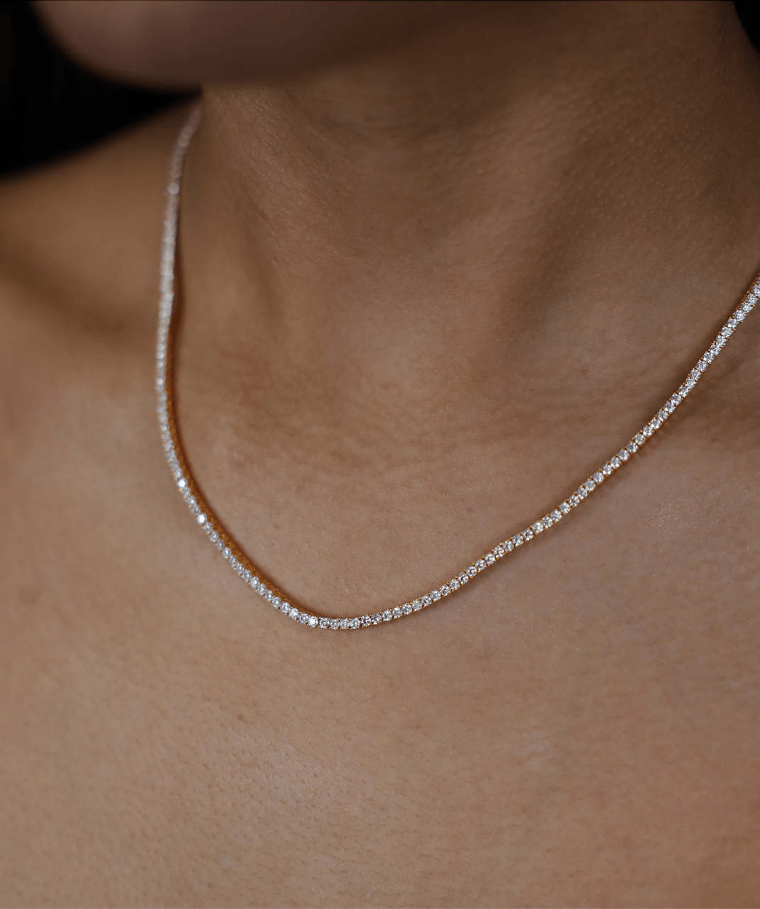 The micro tennis necklace refines the classic design with a subtle 2mm profile, ensuring a clean and understated look while maintaining high brilliance. Hand-set stones create a seamless flow of light, catching the eye without being overpowering. Lightweight and versatile, it transitions easily from everyday wear to elevated occasions.