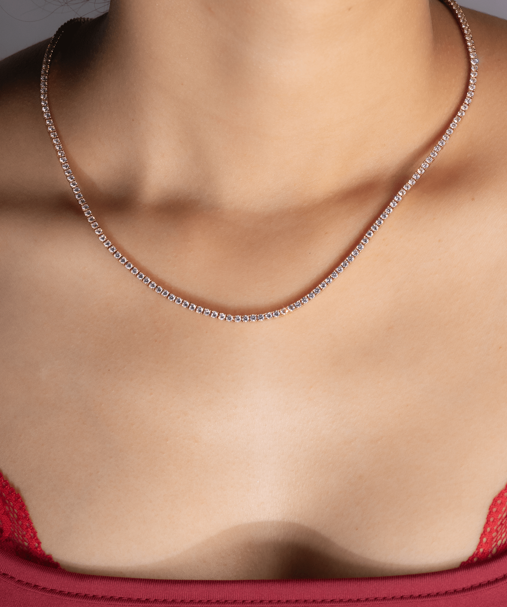 The micro tennis necklace refines the classic design with a subtle 2mm profile, ensuring a clean and understated look while maintaining high brilliance. Hand-set stones create a seamless flow of light, catching the eye without being overpowering. Lightweight and versatile, it transitions easily from everyday wear to elevated occasions.