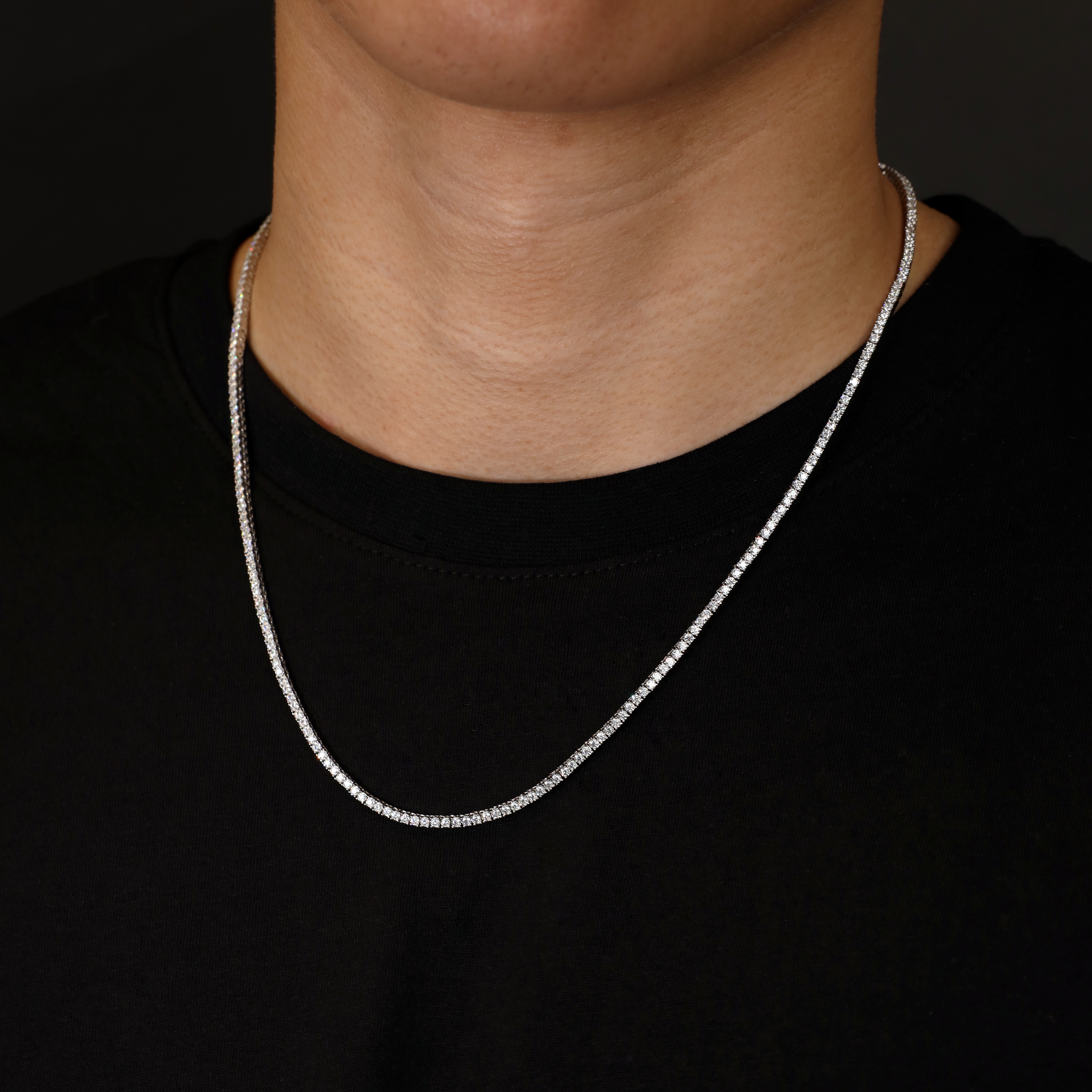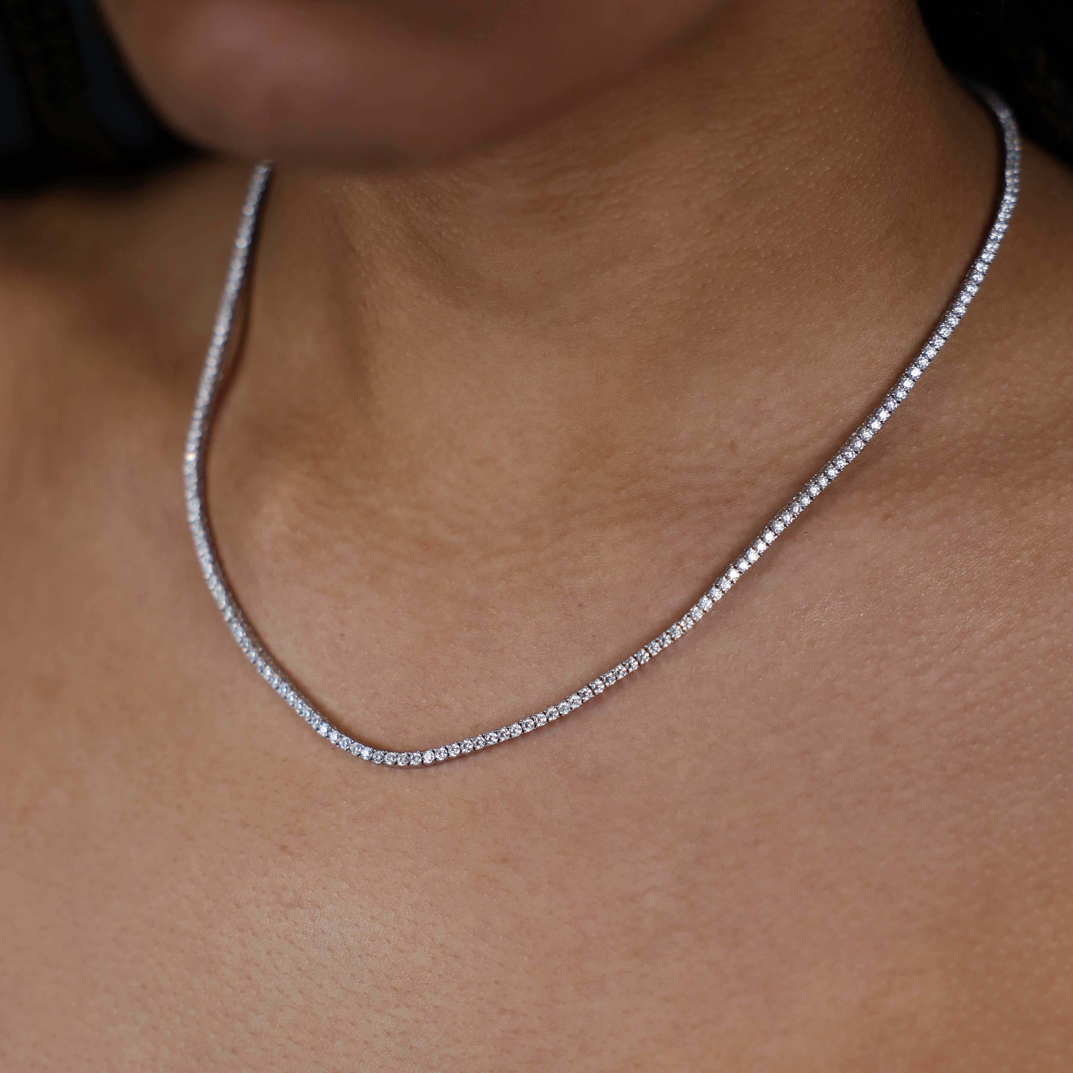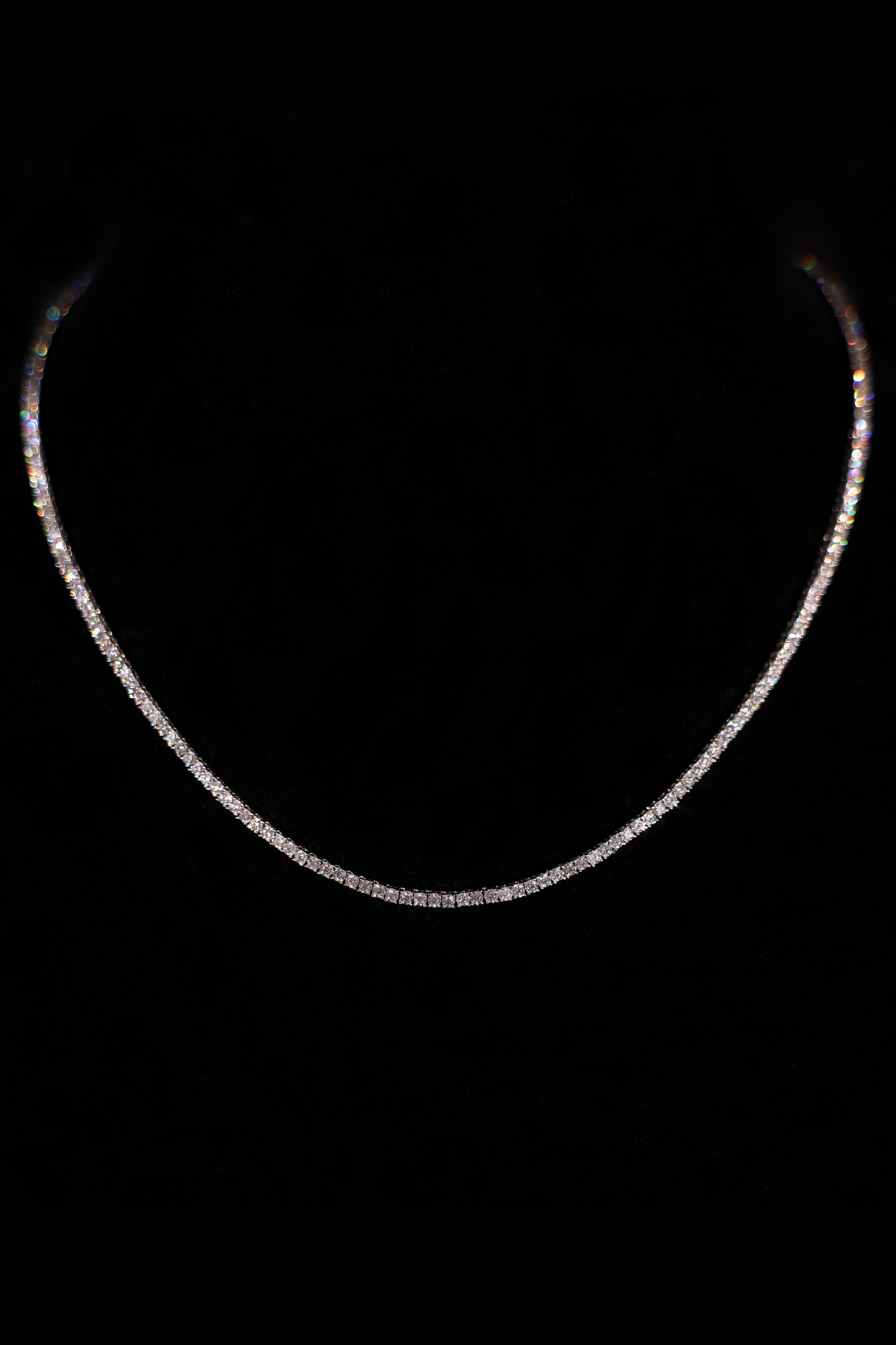 The micro tennis necklace refines the classic design with a subtle 2mm profile, ensuring a clean and understated look while maintaining high brilliance. Hand-set stones create a seamless flow of light, catching the eye without being overpowering. Lightweight and versatile, it transitions easily from everyday wear to elevated occasions.