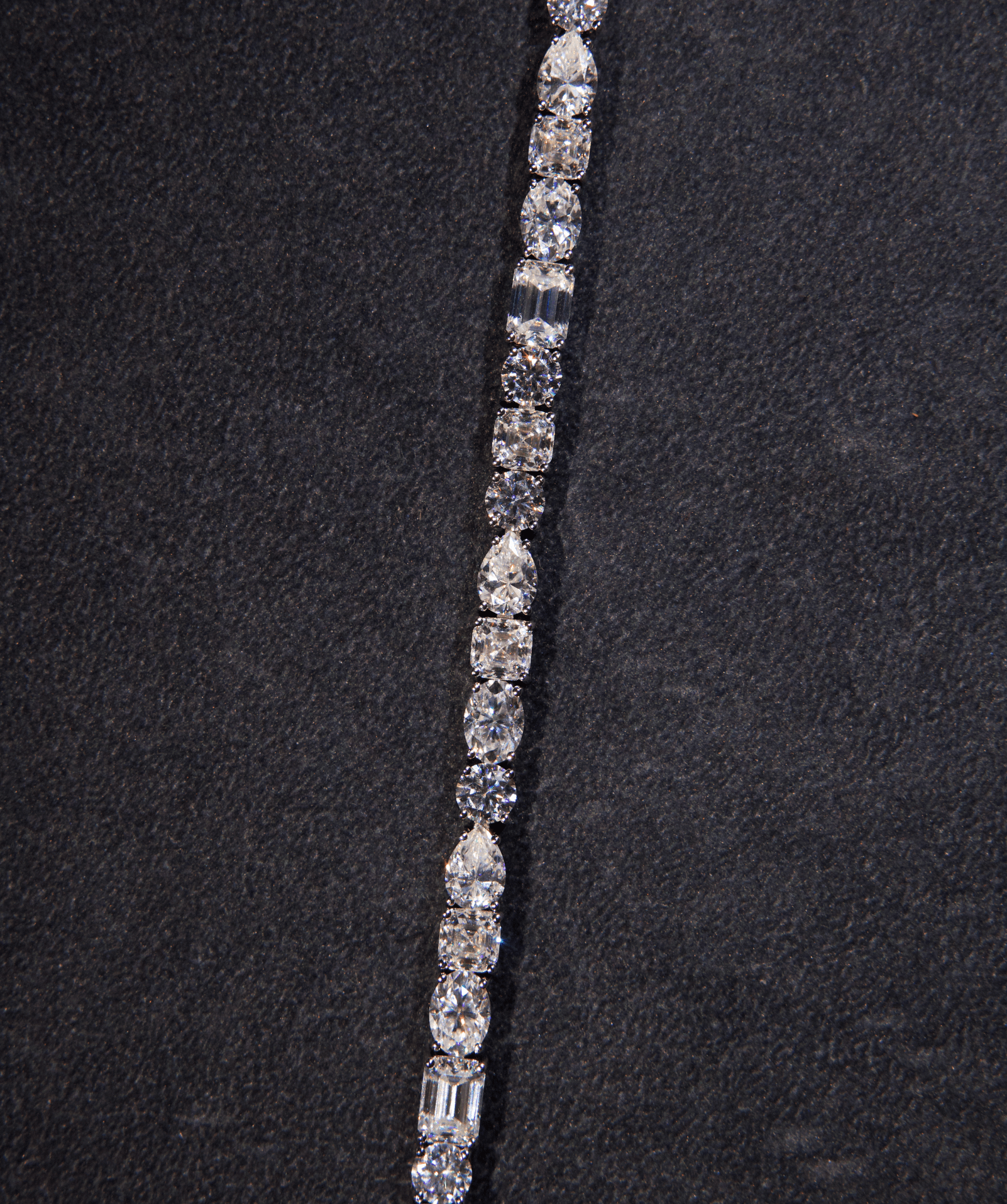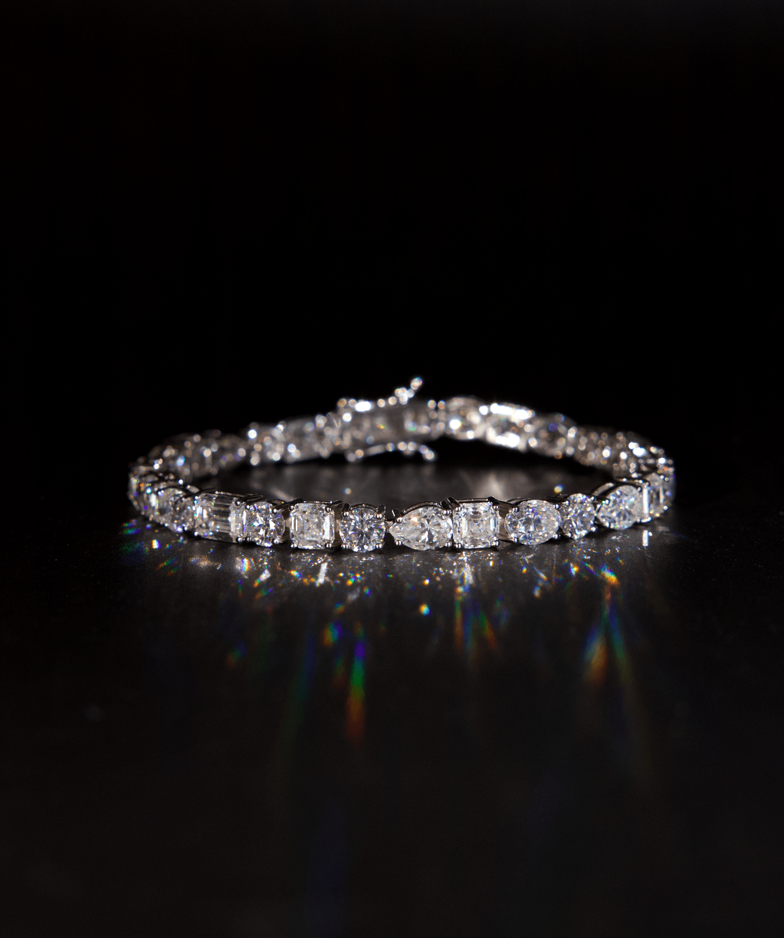 The Mixed Shape Tennis Bracelet is a refined statement piece, balancing symmetry with contrast. Featuring a dynamic blend of round, oval, pear, emerald, cushion, and radiant-cut stones, each link is set to maximise light reflection and brilliance. A seamless open box clasp ensures a secure yet elegant fit.