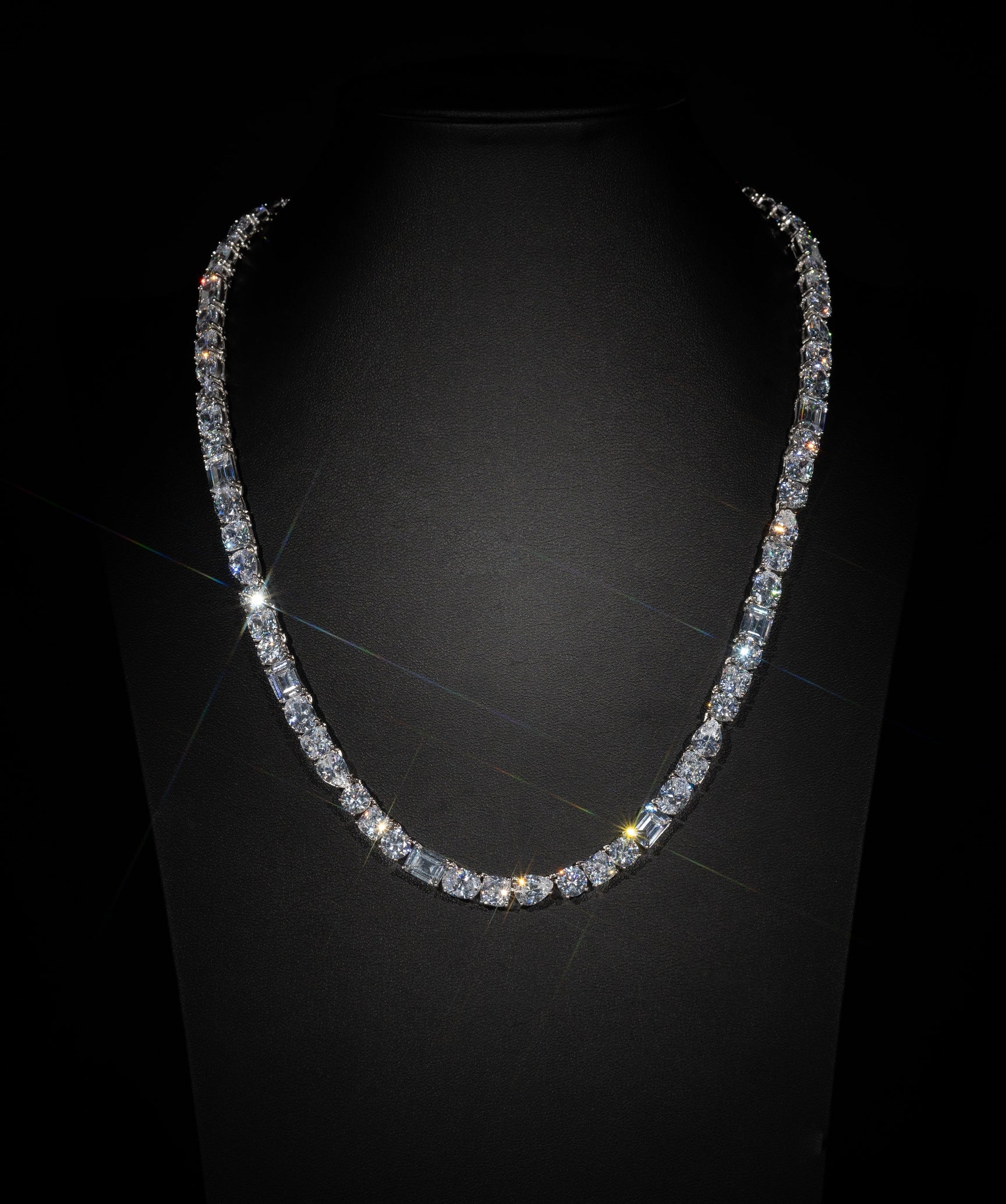 The Mixed Shape Tennis Necklace is a refined statement piece, balancing symmetry with contrast. Featuring a dynamic blend of round, oval, pear, emerald, cushion, and radiant-cut stones, each link is set to maximise light reflection and brilliance. A seamless open box clasp ensures a secure yet elegant fit.