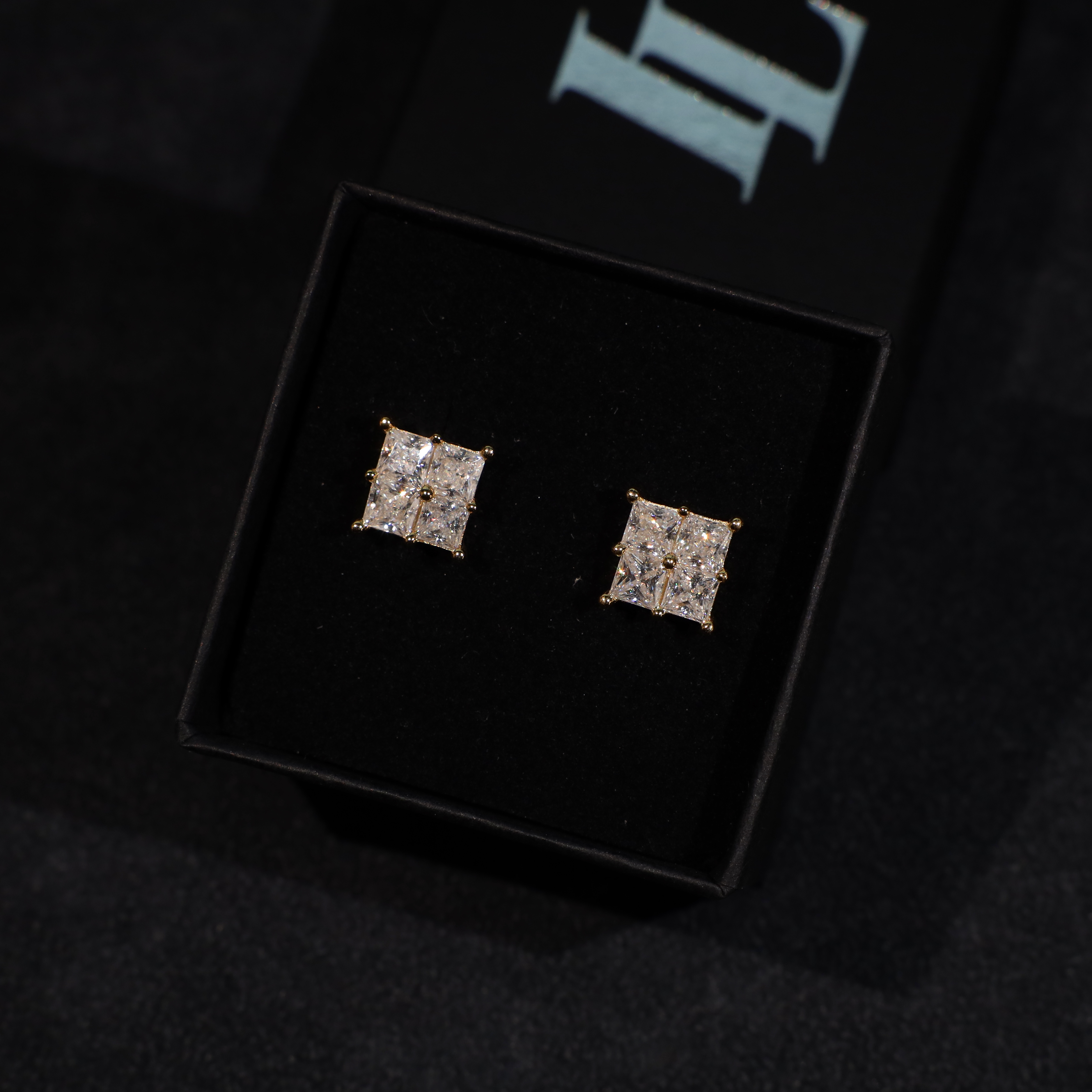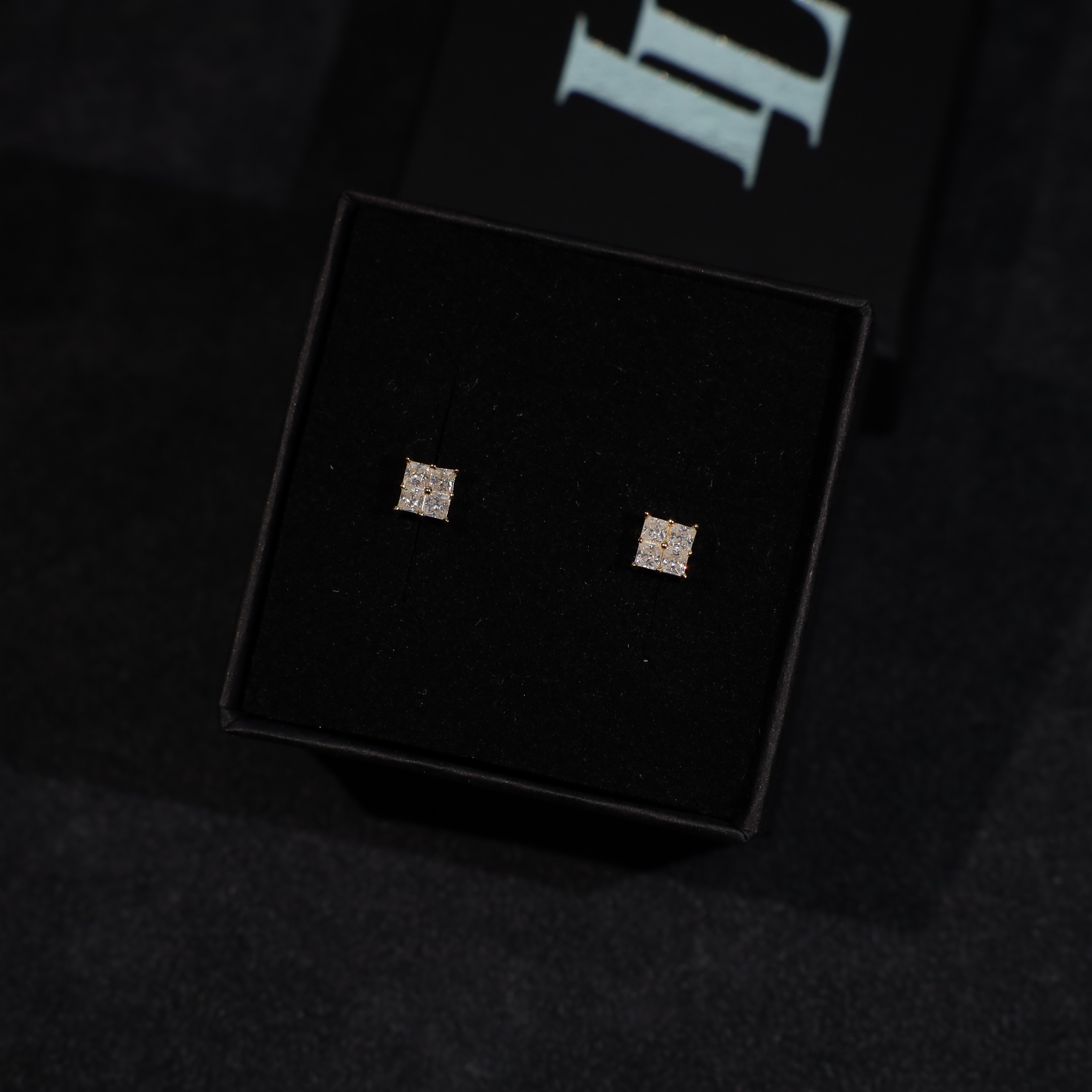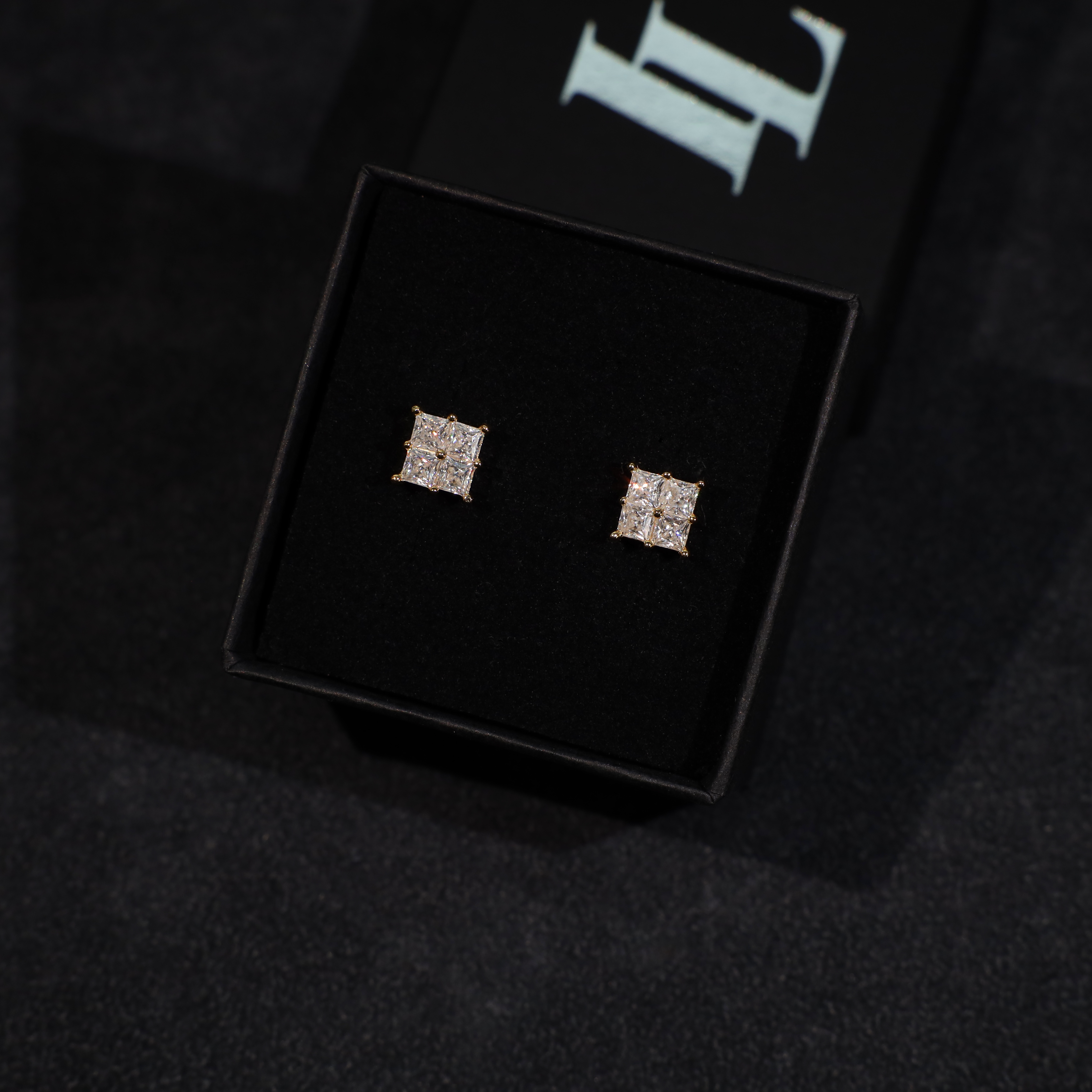 These Quad Princess-Cut Stud Earrings combine four precision-cut moissanite stones into a seamless square, amplifying brilliance and symmetry. Set in yellow gold plated 925 silver with a secure four-prong setting, they create a bold yet refined aesthetic. A contemporary take on the classic stud, available in three sizes to suit different styles.