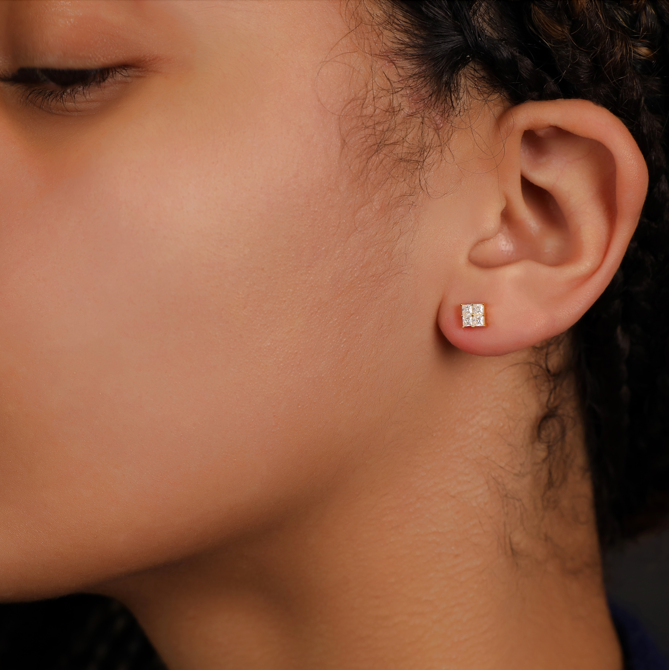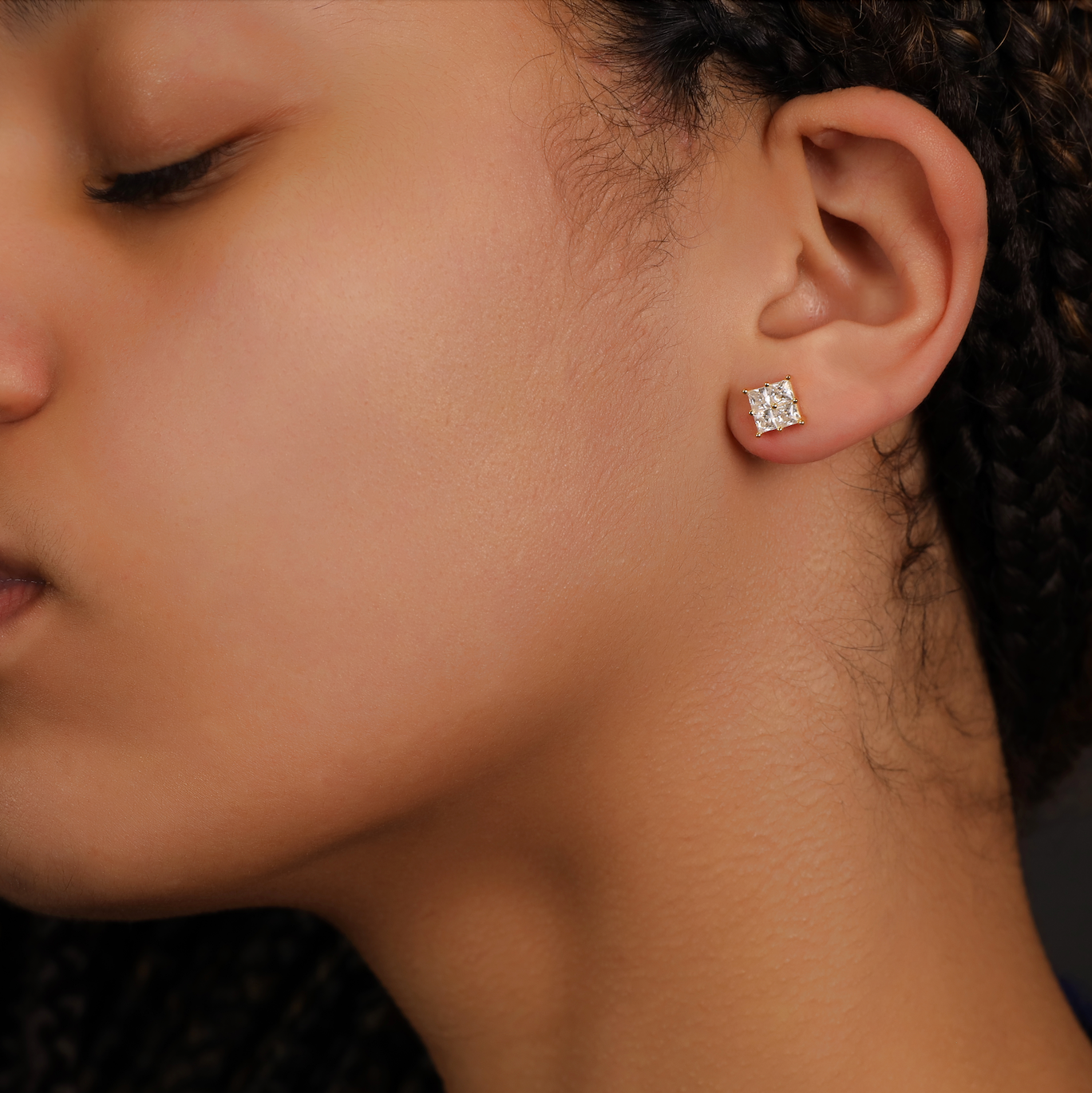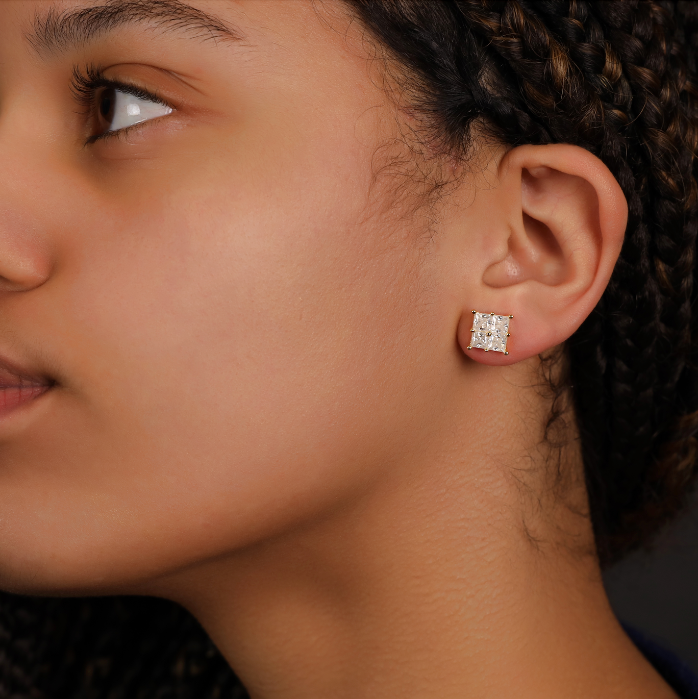 These Quad Princess-Cut Stud Earrings combine four precision-cut moissanite stones into a seamless square, amplifying brilliance and symmetry. Set in yellow gold plated 925 silver with a secure four-prong setting, they create a bold yet refined aesthetic. A contemporary take on the classic stud, available in three sizes to suit different styles.