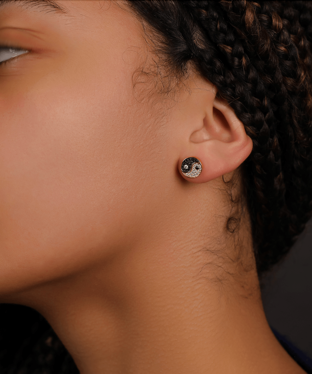 The Yin Yang Earrings symbolise harmony and duality, blending contrasting elements into a refined statement piece. Featuring meticulously pavé-set black and white VVS moissanite stones, these earrings create a striking visual balance that reflects the unity of opposites. Crafted in 925 silver with a high-polish yellow gold plating, they offer lasting brilliance and durability. The structured 3D design enhances depth, making the symbol stand out with a bold yet wearable look. A secure push-back closure ensures a comfortable and reliable fit for all-day wear.
