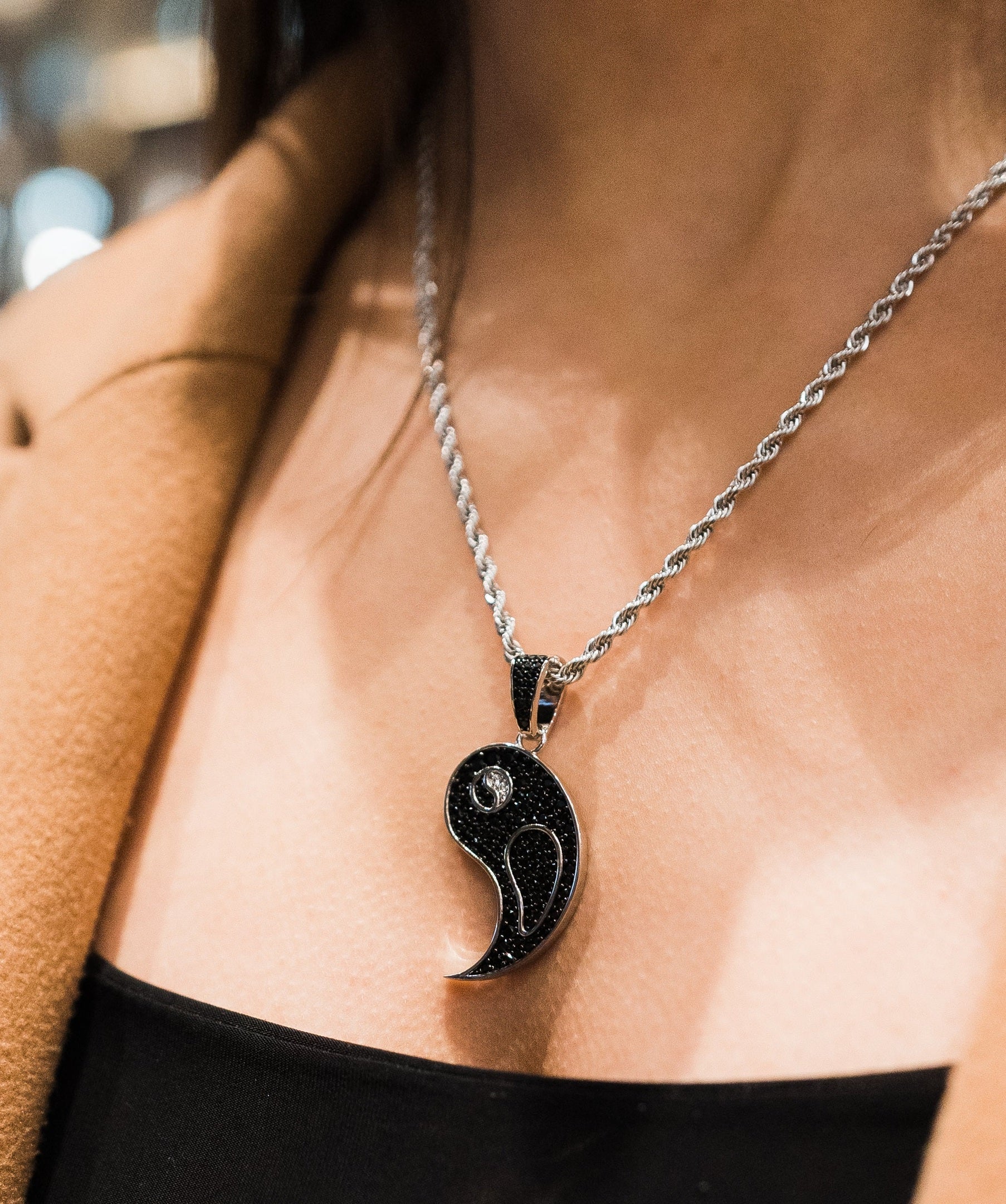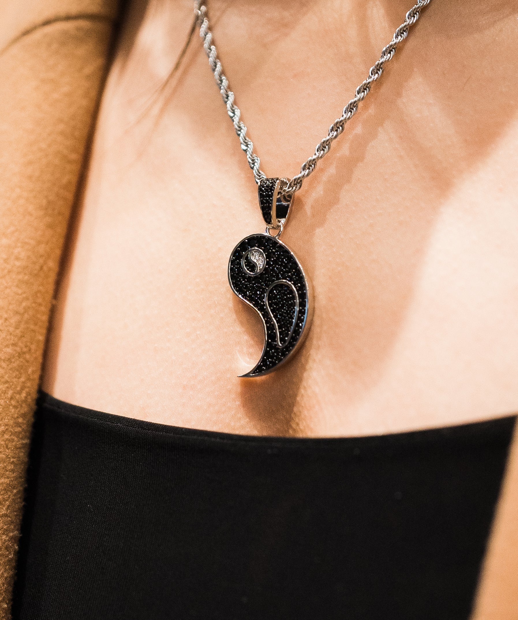 This Iced London Iced Yin / Iced Yang Pendant is inspired by the Ancient Chinese philosophy, yin and yang, which is a concept of dualism, describing how seemingly opposite or contrary forces may actually be complementary, interconnected, and interdependent in the natural world, and how they may give rise to each other as they interrelate to one another.